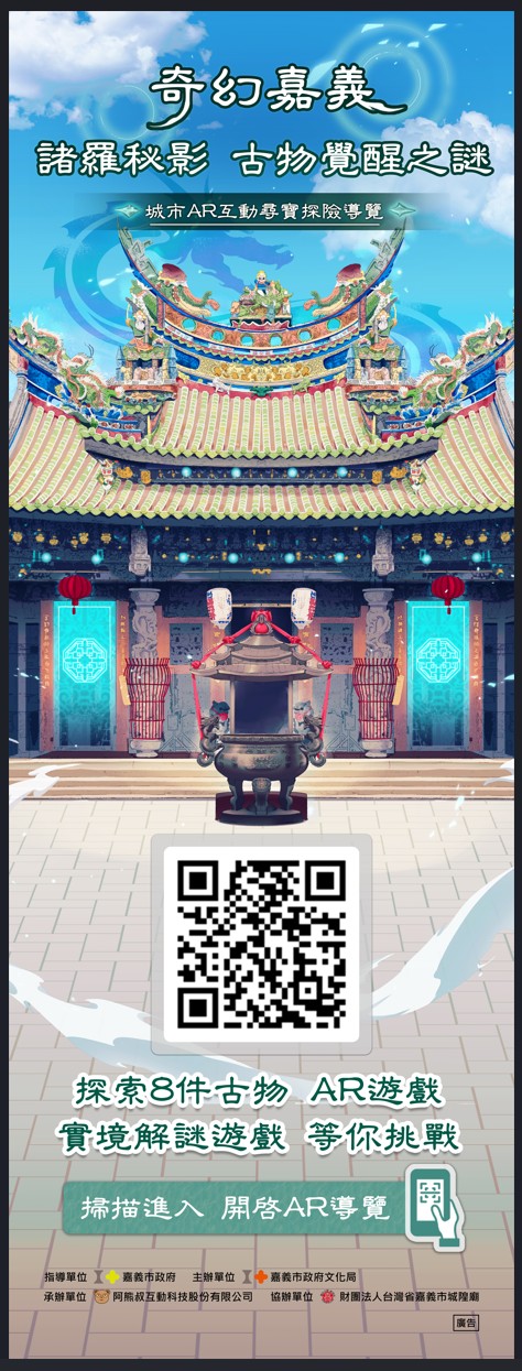 「奇幻嘉義《諸羅秘影—古物覺醒之謎》城市AR互動尋寶探險」活動時間自8月16日(六)起至9月21日(日)止。活動以嘉義市城隍廟為核心,結合城隍廟八件歷史古物,運用擴增實境(AR)、導覽解說、3D動畫、互動遊戲與實境解謎劇情,引領民眾深度探索嘉義的歷史文化底蘊。民眾僅需掃描現場提供的QR Code,並啟動本次精選八件歷史古物的探索,參與者彷彿置身一場數位尋寶之旅。系統將展示AR互動劇場,重現歷史情境,並依序引導參與者完成互動任務與實境解謎挑戰,玩家將逐步揭開中元祭典與嘉義城隍的解謎故事。