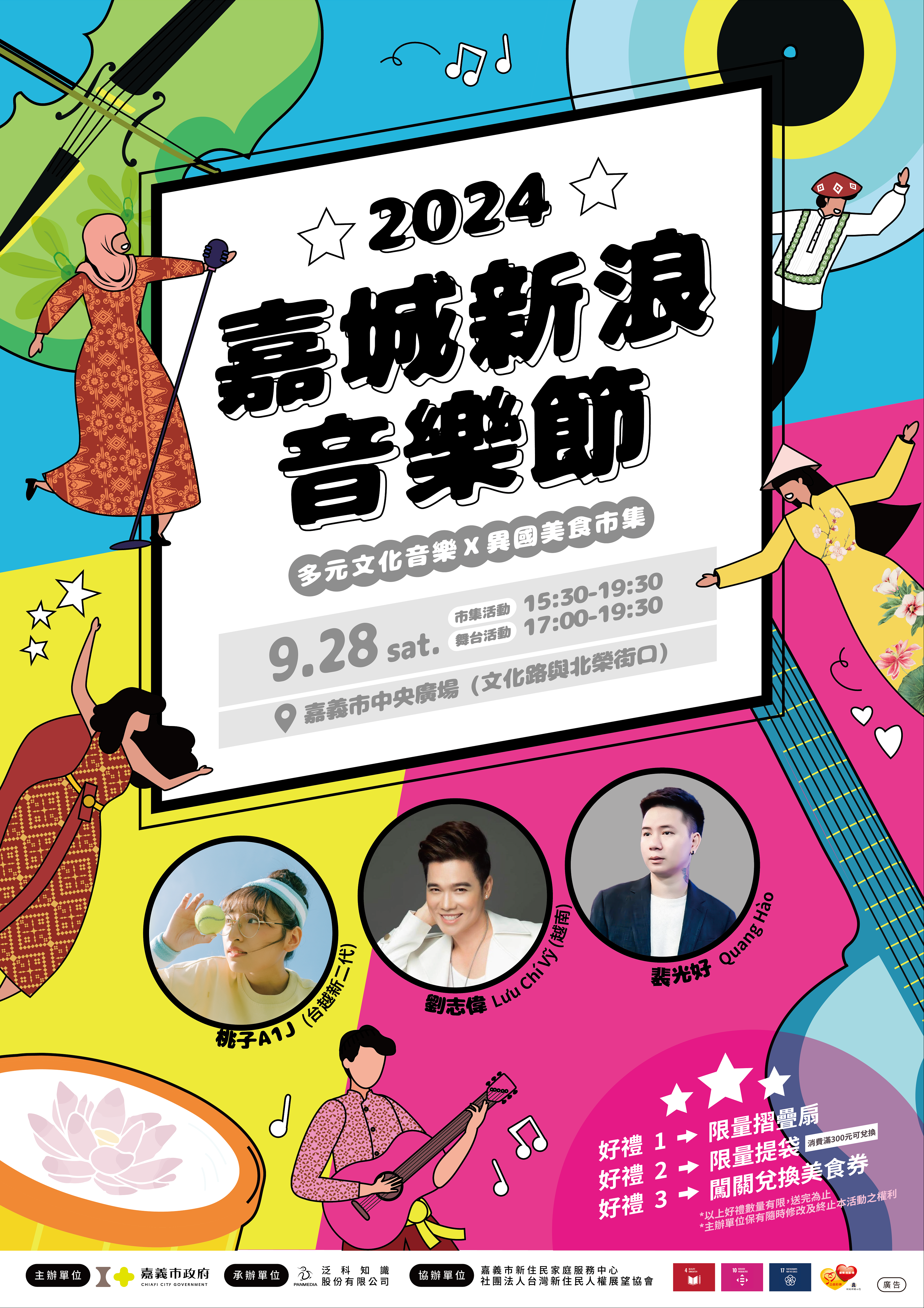 嘉義市政府府舉辦113年度「嘉城新浪音樂節」活動,邀請來自越南的異國歌手、新住民及新二代表演團體,以音樂舞蹈的交流形式進行異國音樂文化演出,並設置異國美食文創市集攤位,推動多元族群共融,竭誠歡迎一同參與。