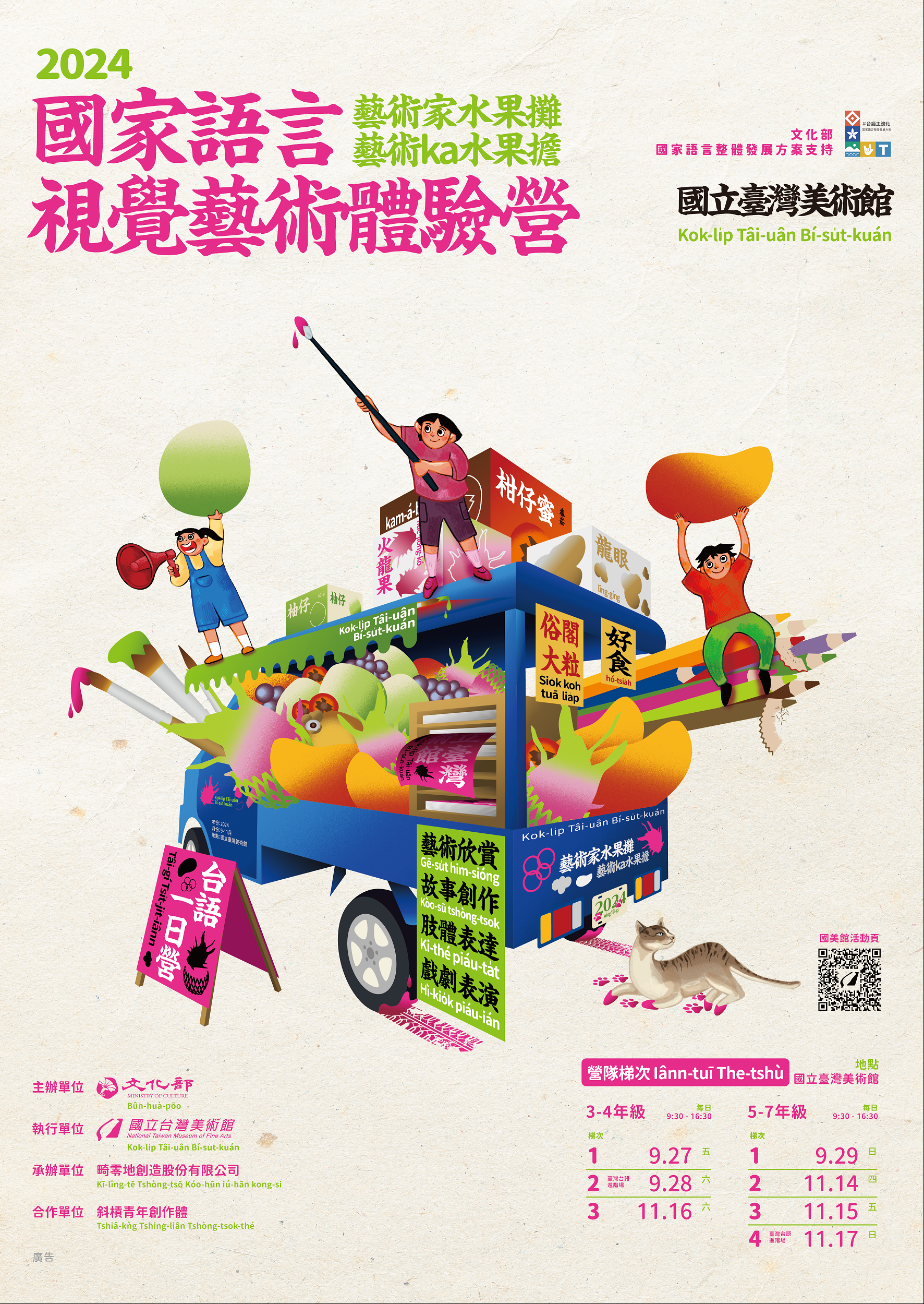 一、國立臺灣美術館為呼應國家語言發展推廣與復振,結合館藏特色營造語言、藝術、文化共融之沉浸式學習環境,將於113年9月及11月辦理「2024國家語言視覺藝術體驗營-藝術家水果攤|藝術ka水果擔」一日營活動。