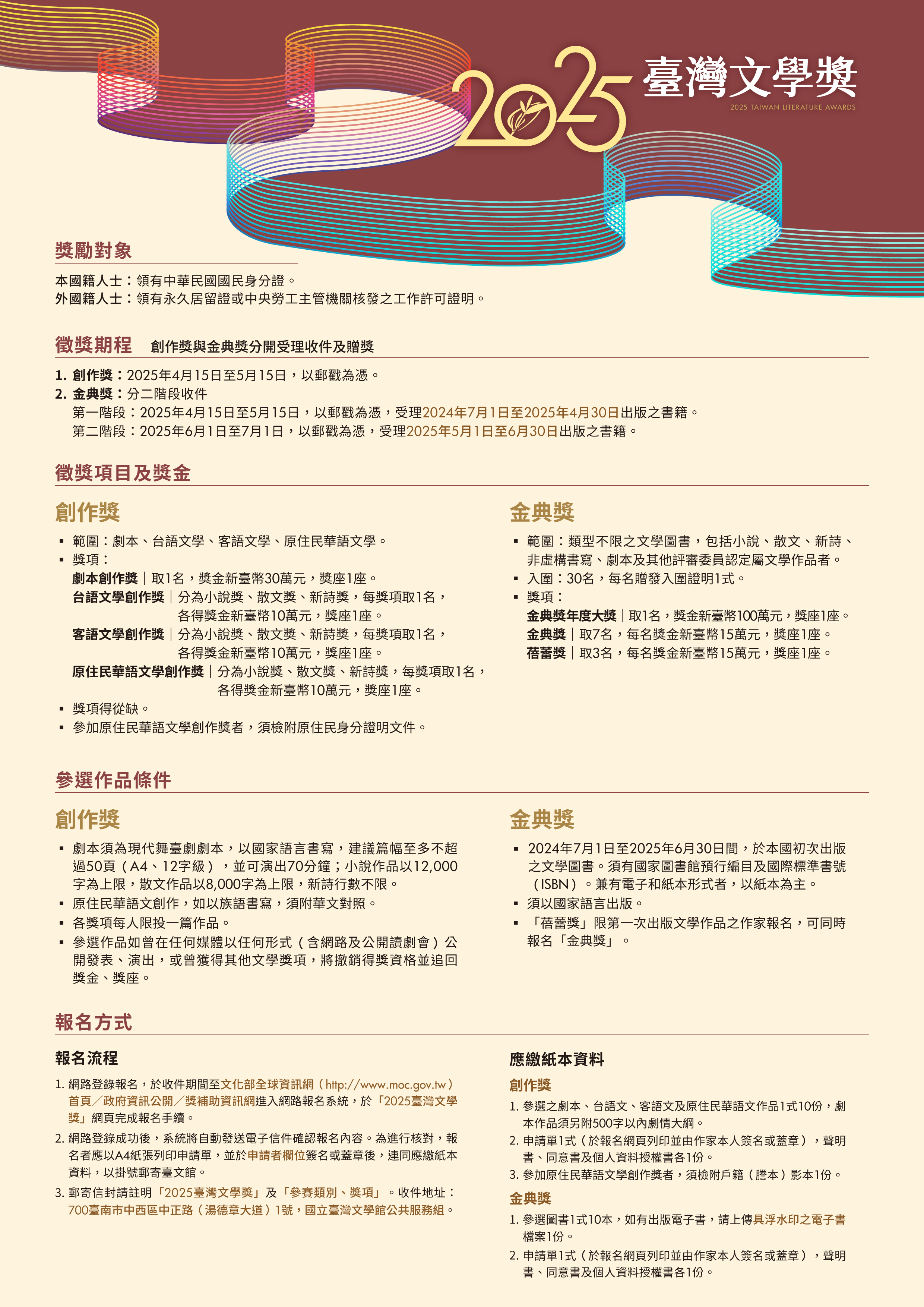 三、敬請於所轄網站、社群平台、跑馬燈或媒體螢幕等宣傳管 道協助公告以下徵獎訊息:「2025臺灣文學獎」創作獎徵 件日期為114年4月15日至5月15日;金典獎徵件分兩階段報 名,第一階段自114年4月15日起至5月15日止,第二階段自 114年6月1日起至7月1日止,總獎金370萬元,歡迎踴躍報 名參加徵獎。
