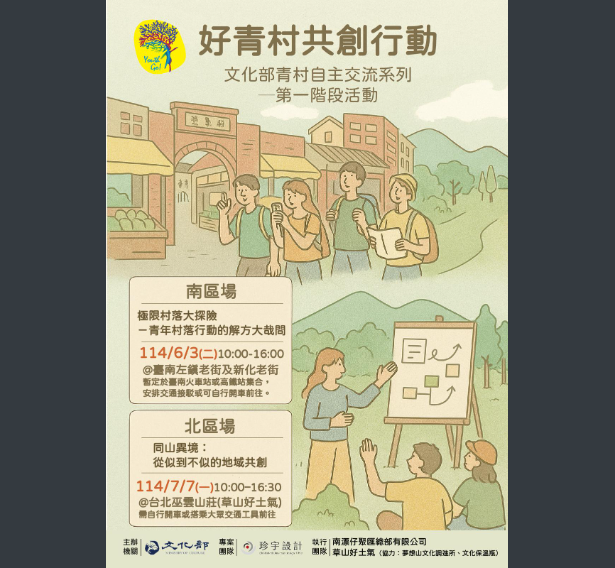 洽詢專線: (1)草山好土氣|林樂昕、陳郁琦|02-2862-7627 (2)114年文化部青年村落文化行動計畫專案團隊(珍宇設計工程顧問有限公司)|陳怡靜專案經理 |02-2931-1868|youngplan113@gmail.com
