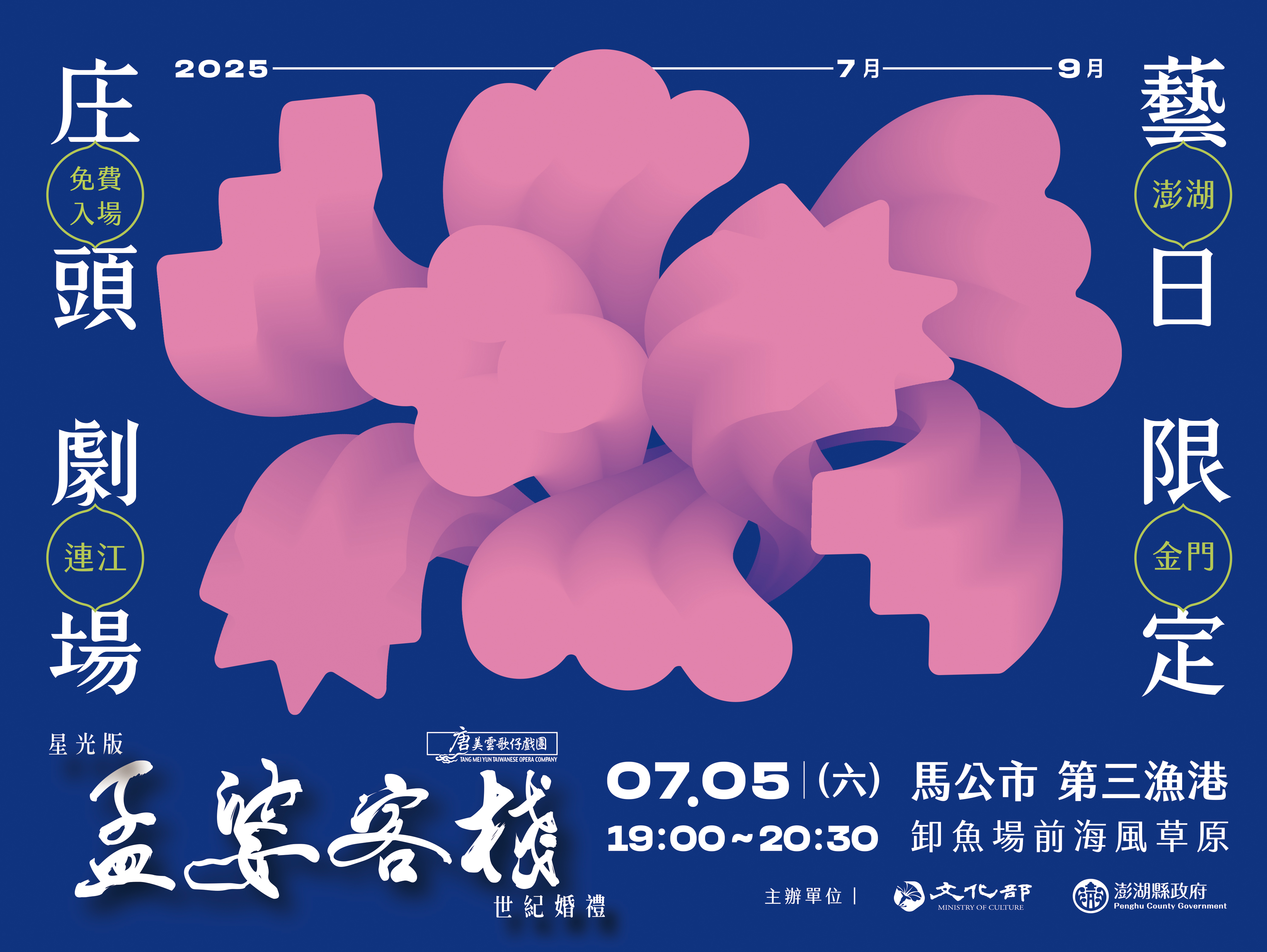 本活動訂於114年7月5日晚間7時至8時30分假本縣馬公市第三漁港卸魚場前海風草原辦理,由唐美雲歌仔戲團演出,民眾免費入場觀賞。