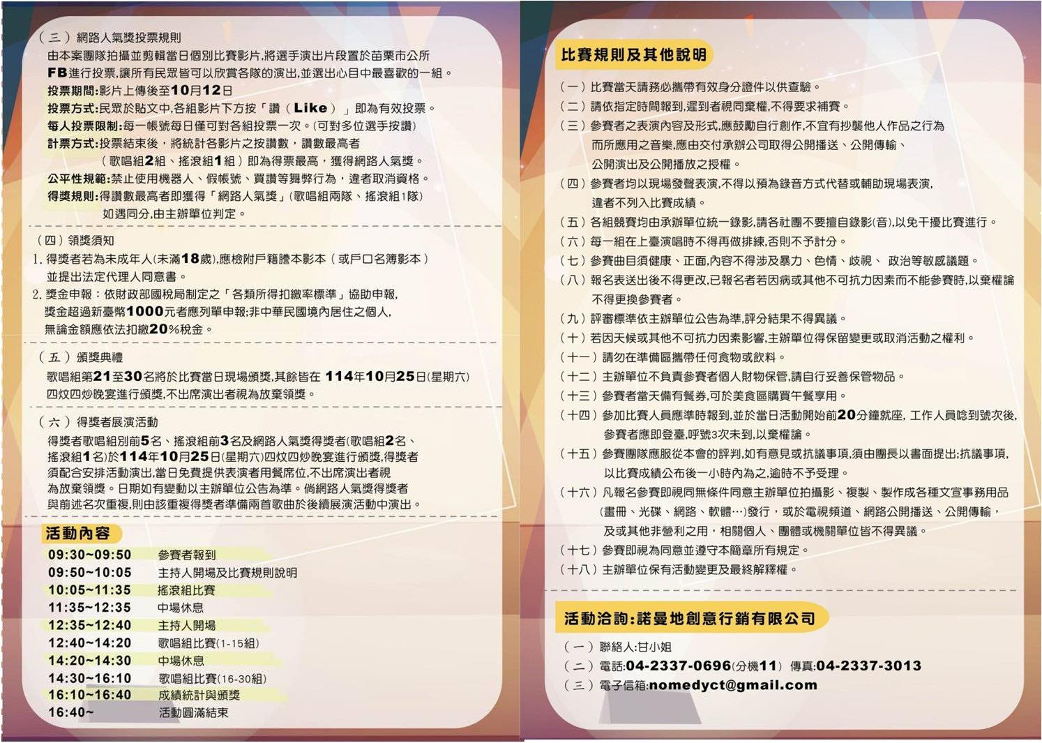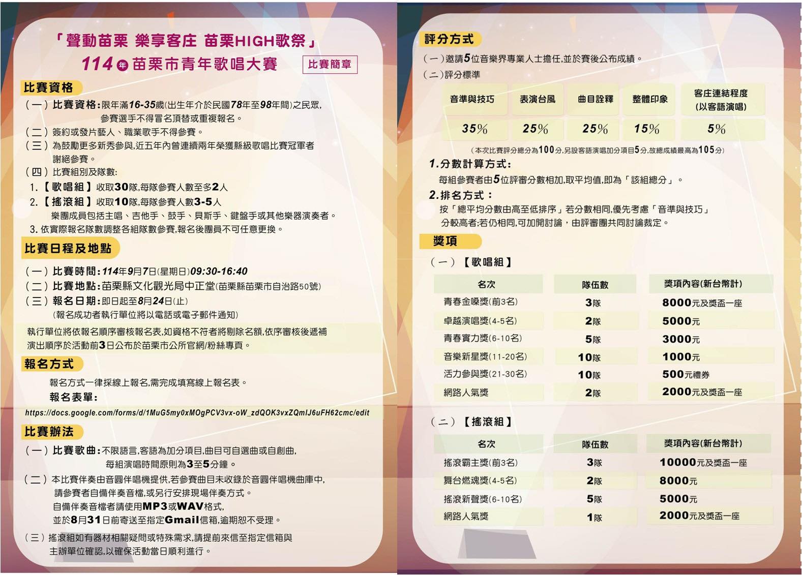 轉知-苗栗縣苗栗市公所「114苗栗市青年歌唱大賽服務委託案」活動海報及簡章各1份