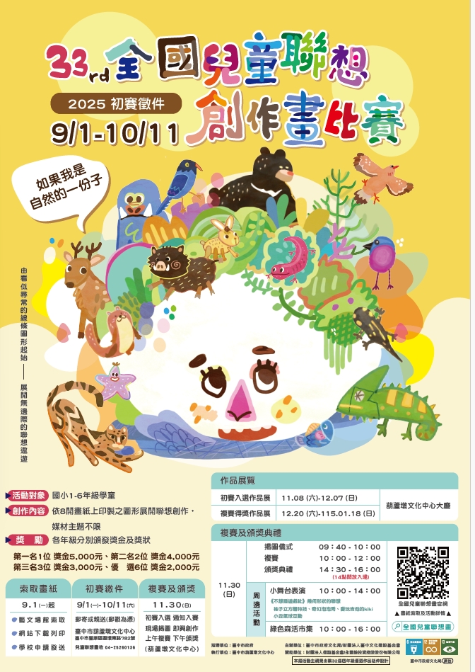 本屆初賽徵件,預計於114年9月1日(星期一)開始,截止收件日期為114年10月11日(星期六),依8開畫紙上印製之圖形展開聯想創作,媒材主題不限;複賽暨頒獎典禮訂於114年11月30日(星期日)於臺中市葫蘆墩文化中心辦理;其餘活動詳情請參閱海報或畫紙。