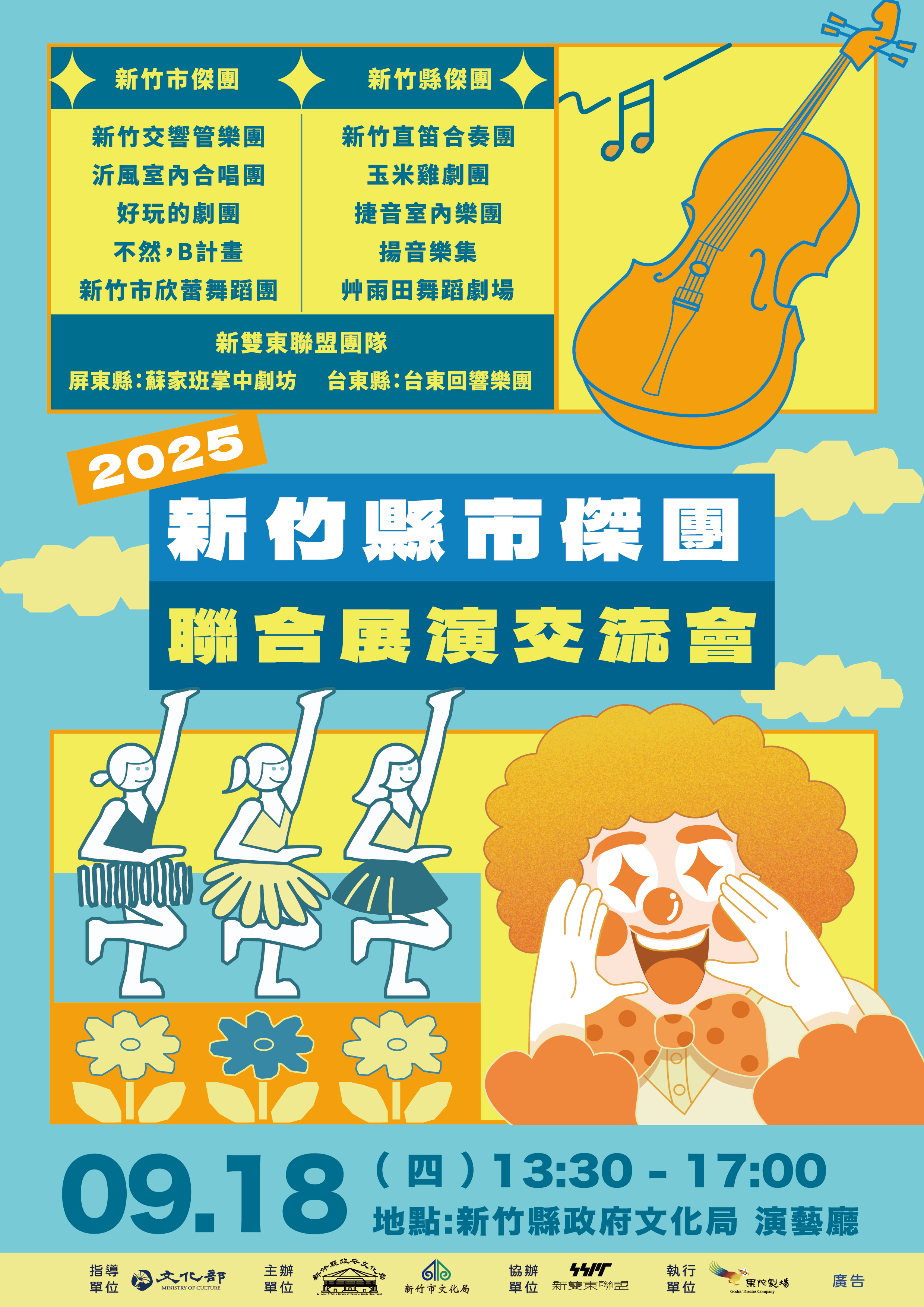 (四)參與團隊:新竹直笛合奏團、玉米雞劇團、Allegro Chamber Ensemble捷音室內樂團、揚音樂集、艸雨田舞蹈劇場;新竹交響管樂團、沂風室內合唱團、新竹市欣蕾舞蹈團、好玩的劇團、不然,B計畫;台東回響樂團、蘇家班掌中劇坊。