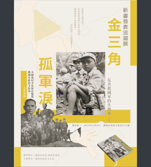 一、由桃園市政府文化局與全國眷村文化保存聯盟共同出版的 《金三角孤軍淚-反共救國軍的生與死》,聚焦38年國軍退守金三角的歷史,透過口述訪談與珍貴影像,真實呈現雲南反共救國軍在泰緬邊境三十年的奮戰歷程,歡迎有興趣的民眾至馬祖新村參觀「孤軍淚新書發表巡迴展」。