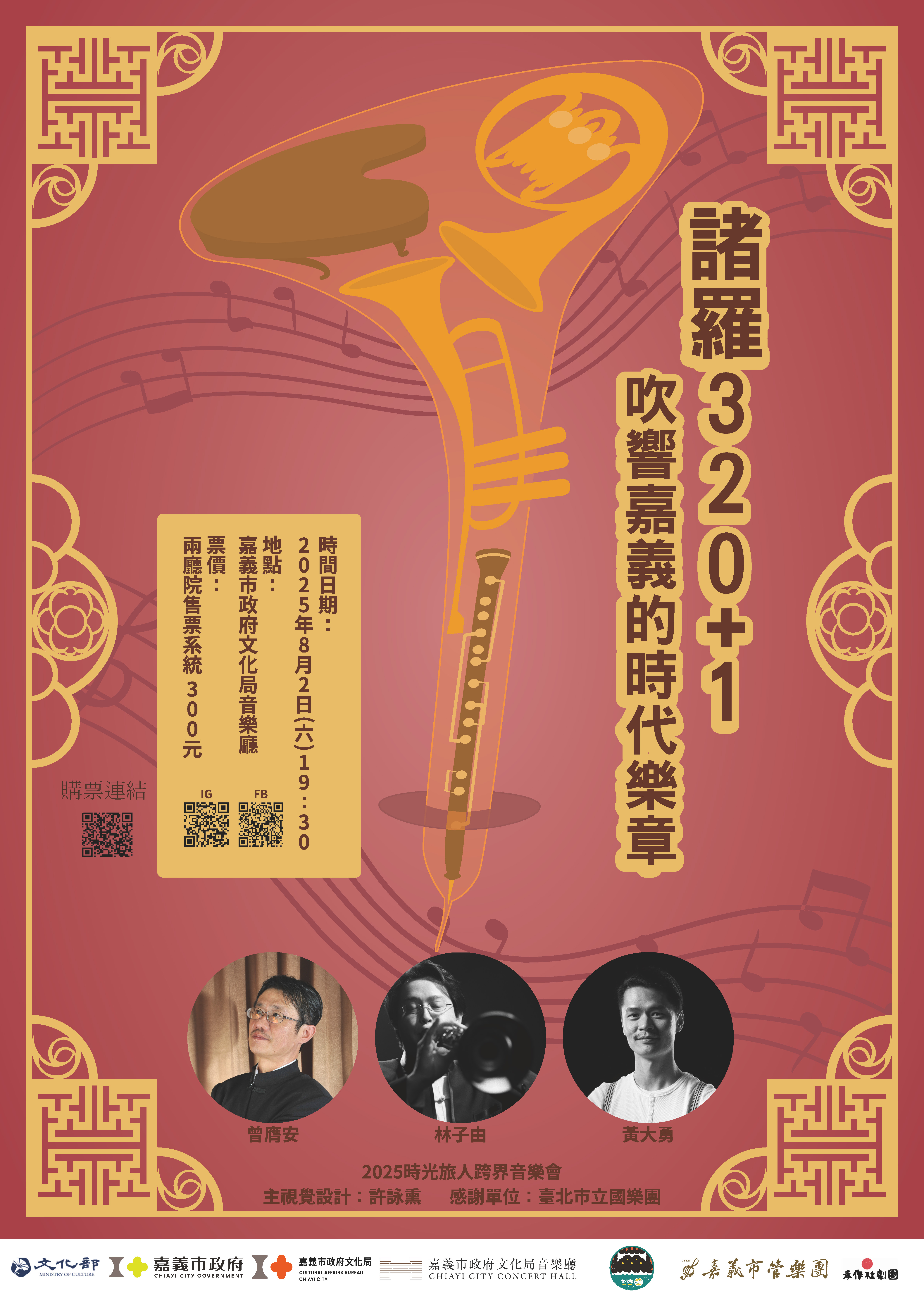 2025年,諸羅建城321週年,嘉義市管樂團重磅推出跨界鉅作《諸羅320+1:吹響嘉義的時代樂章》!特邀禾作社劇團黃大勇導演、臺北市立國樂團林子由老師攜手合作,結合音樂、劇場與歷史,打造前所未有的沉浸式文化饗宴。演出最大亮點是郭宗翰老師全新創作《諸羅風華》世界首演,嗩吶與管樂激盪中西風情。還有充滿驚喜的小丑角色,幽默穿梭清代、日治到現代,讓大家笑著穿越嘉義三百多年風華!一起見證嘉義的過去、現在與未來,體驗管樂團的無限創新,絕對不容錯過!