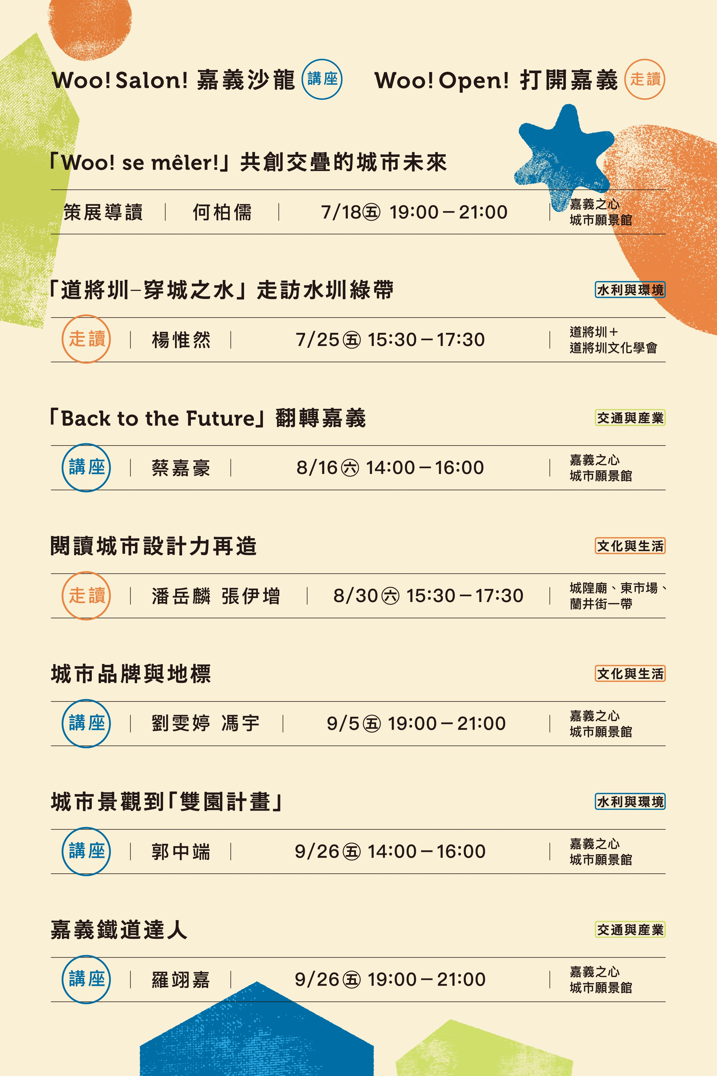 一、旨揭活動以「Woo!Salon!–嘉義沙龍」及「Woo!Open !– 打開嘉義」為主題,總共規劃七場次的主題系列活動,邀請專家專題講座與走讀城市。