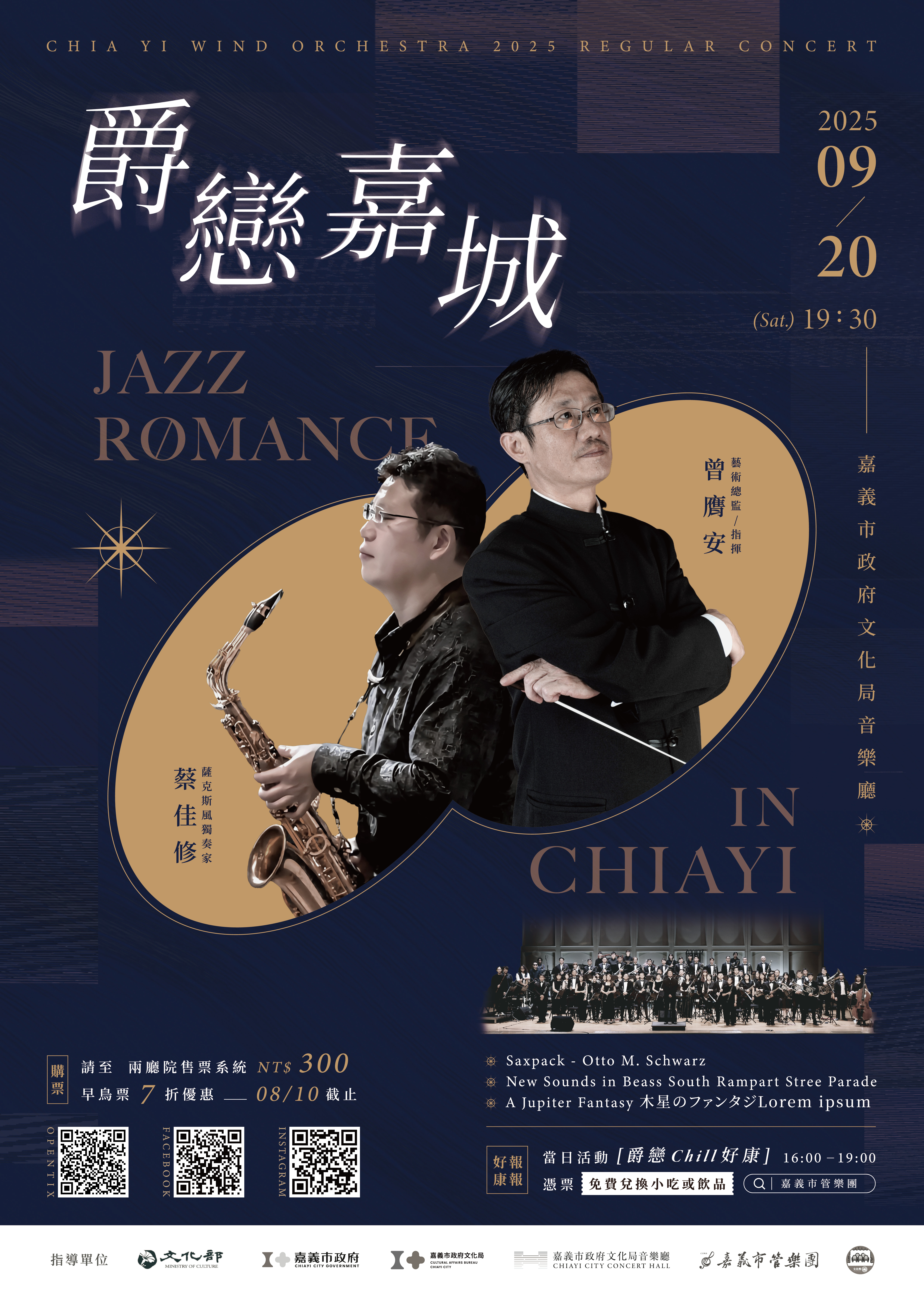夜色降臨,進場後由管樂團攜手薩克斯風名家蔡佳修老師,展開一場融合爵士、管樂與世界音樂的夢幻盛宴。現場將帶來獨奏即興、樂團協奏與多元編制,展現嘉義市管樂團三十一年來的藝術底蘊與創新能量。邀請與親友同行,在音樂、微光、好康美食的陪伴下,共度專屬嘉義的夏夜回憶!