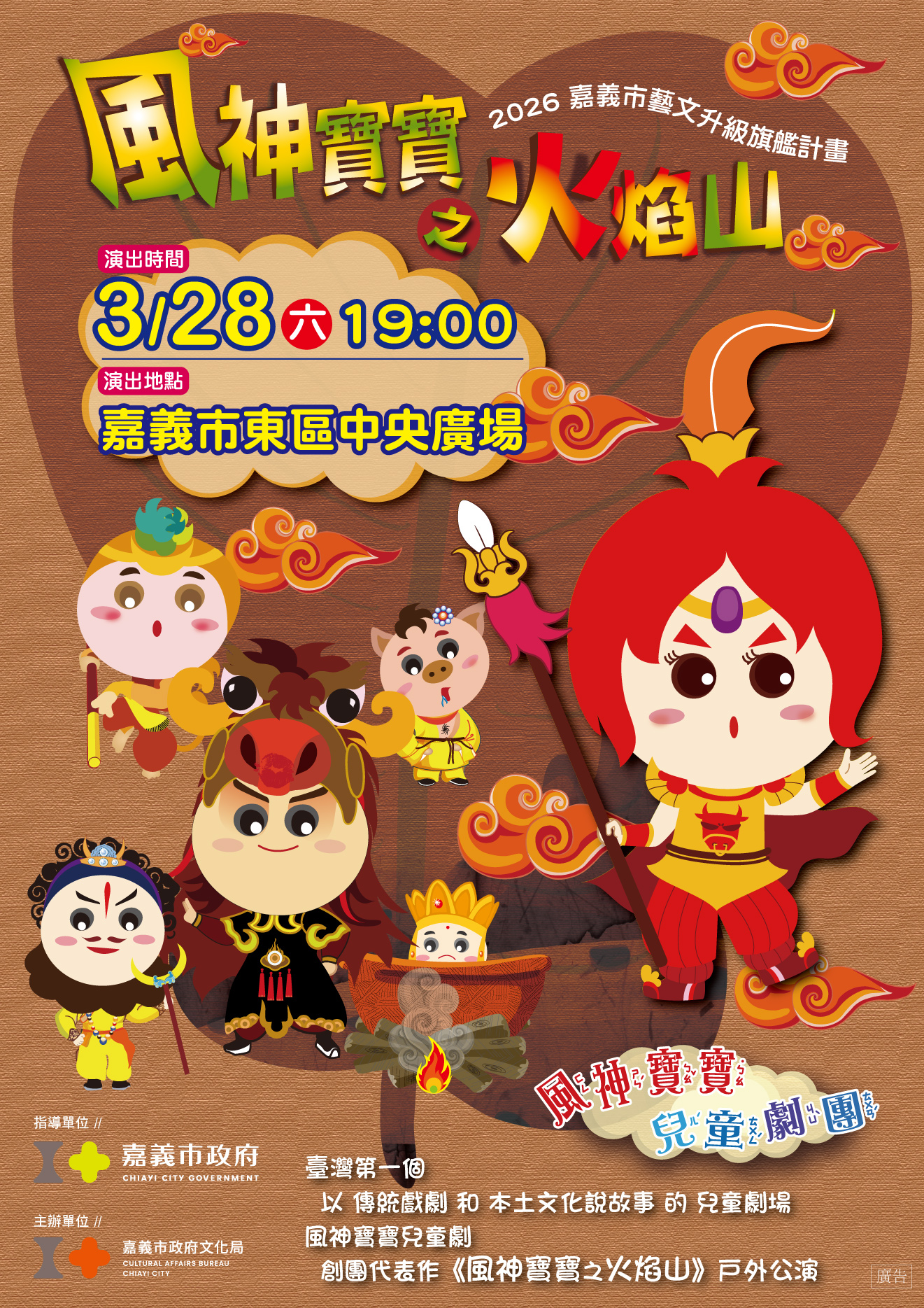 改編自《西遊記》中經典的「火焰山」篇章,結合傳統歌仔戲元素、現代劇場節奏與高度互動的兒童劇形式,打造一齣適合親子共賞、寓教於樂的精緻舞台作品。故事描述唐三藏師徒四人西行取經,途經終年烈焰不熄的火焰山,因酷熱難行而陷入困境。此時,他們遇見了火焰山之子——風神寶寶。風神寶寶雖然擁有強大的力量,卻因課業不佳、常被拿來與「別人家的孩子」比較,而感到自卑與叛逆。