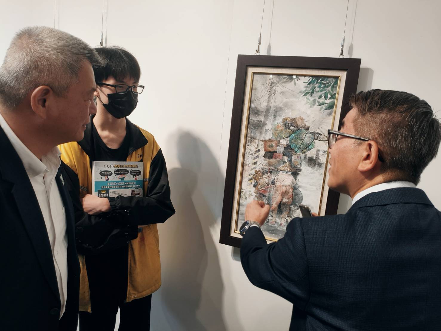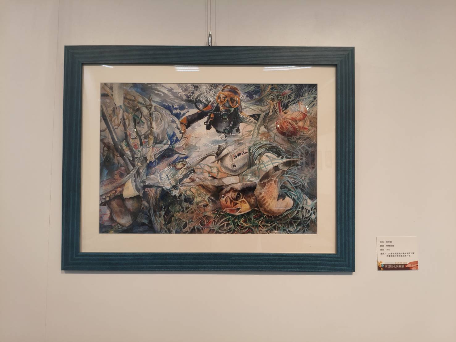 在本次展覽中,亦可欣賞到學生於各項美術競賽中的優異成果。蘭潭國中美術班學生吳亭頡以水彩作品〈無聲溺息〉榮獲114學年度嘉義市學生美術比賽西畫類國中美術班組第一名,作品以細膩的繪畫技巧描繪海洋意象,傳達對海洋環境議題的重視與反思;游尹璇則以水彩作品〈知足〉榮獲同組第二名,以真摯質樸的用色表現勞動者與土地之間真實而緊密的關係,展現深刻的人文關懷。