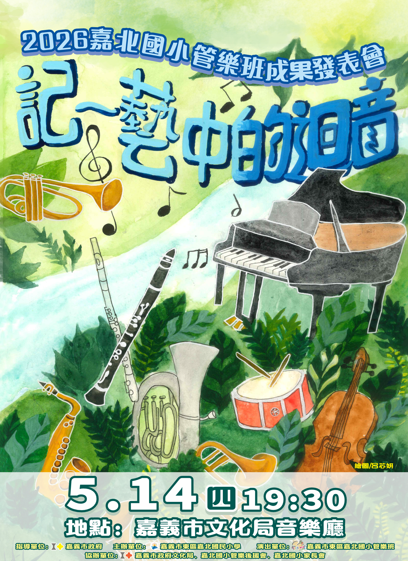 嘉北國小管樂班將於《記~藝中的迴音》音樂會中帶來精彩豐富且多元的課程成果展演。上半場包含童聲合唱以及室內樂曲目,下半場為四個年級不同組合的合奏演出,由指揮簡晟軒老師帶領。