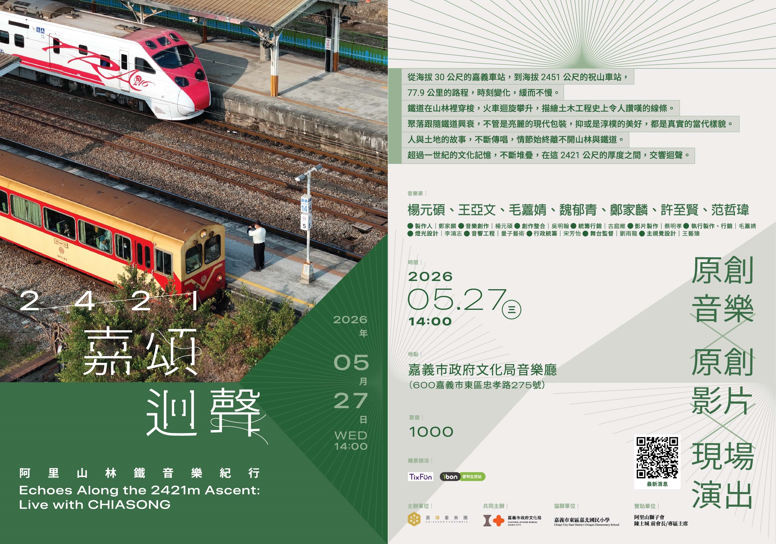 《2421嘉頌迴聲》回來了,從海拔30公尺的嘉義車站,到海拔2451公尺的祝山車站,77.9公里的路程,爬升了2421公尺。在鐵道旁,每一百公尺就有一支里程標,這個長度,或許就是一片茶園,也可能是幾幢房舍,有時候是一道轉彎弧線,說不定恰好是個遙望遠方的缺口。77.9公里的旅程,時刻變化,緩而不慢。