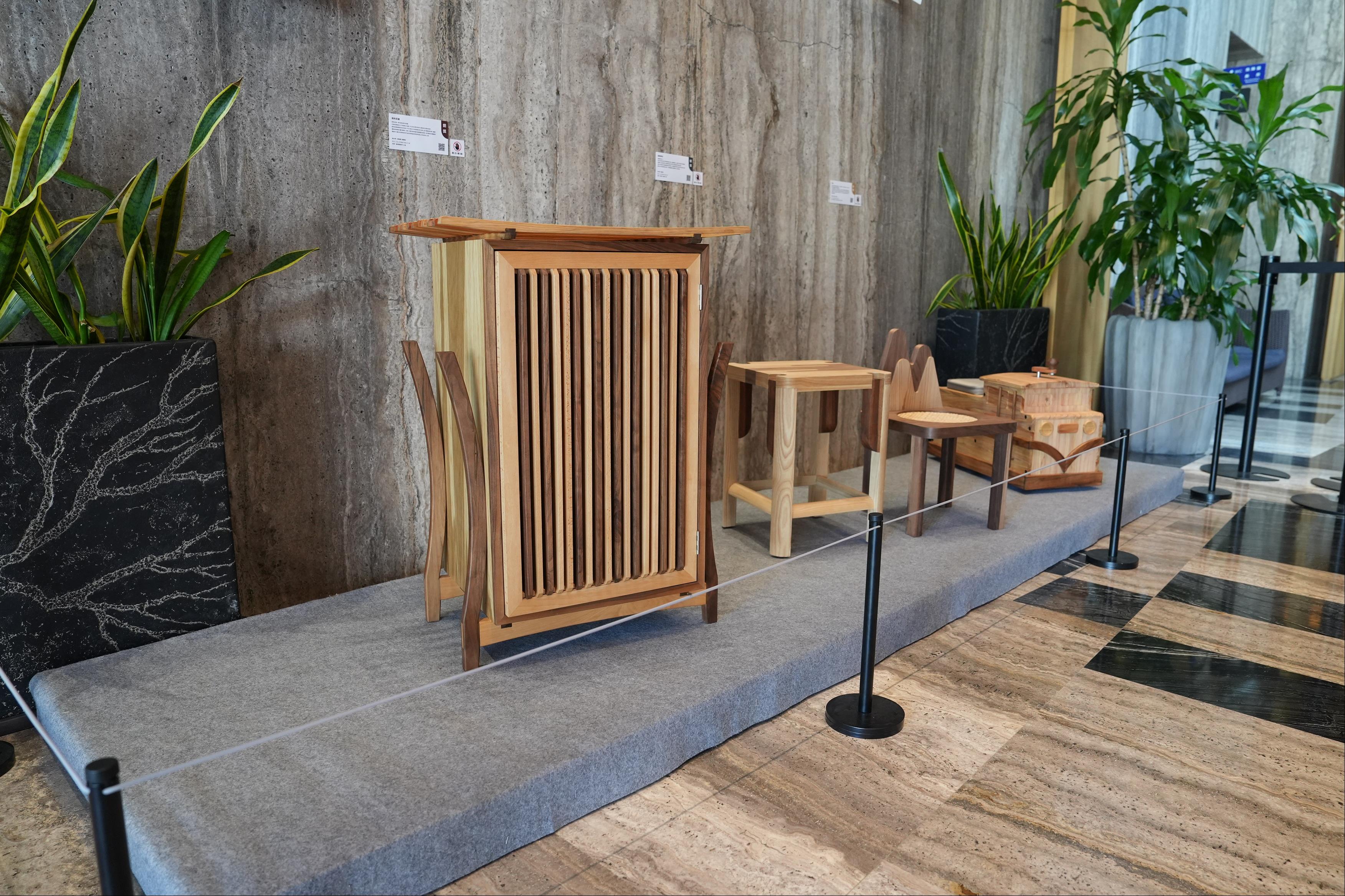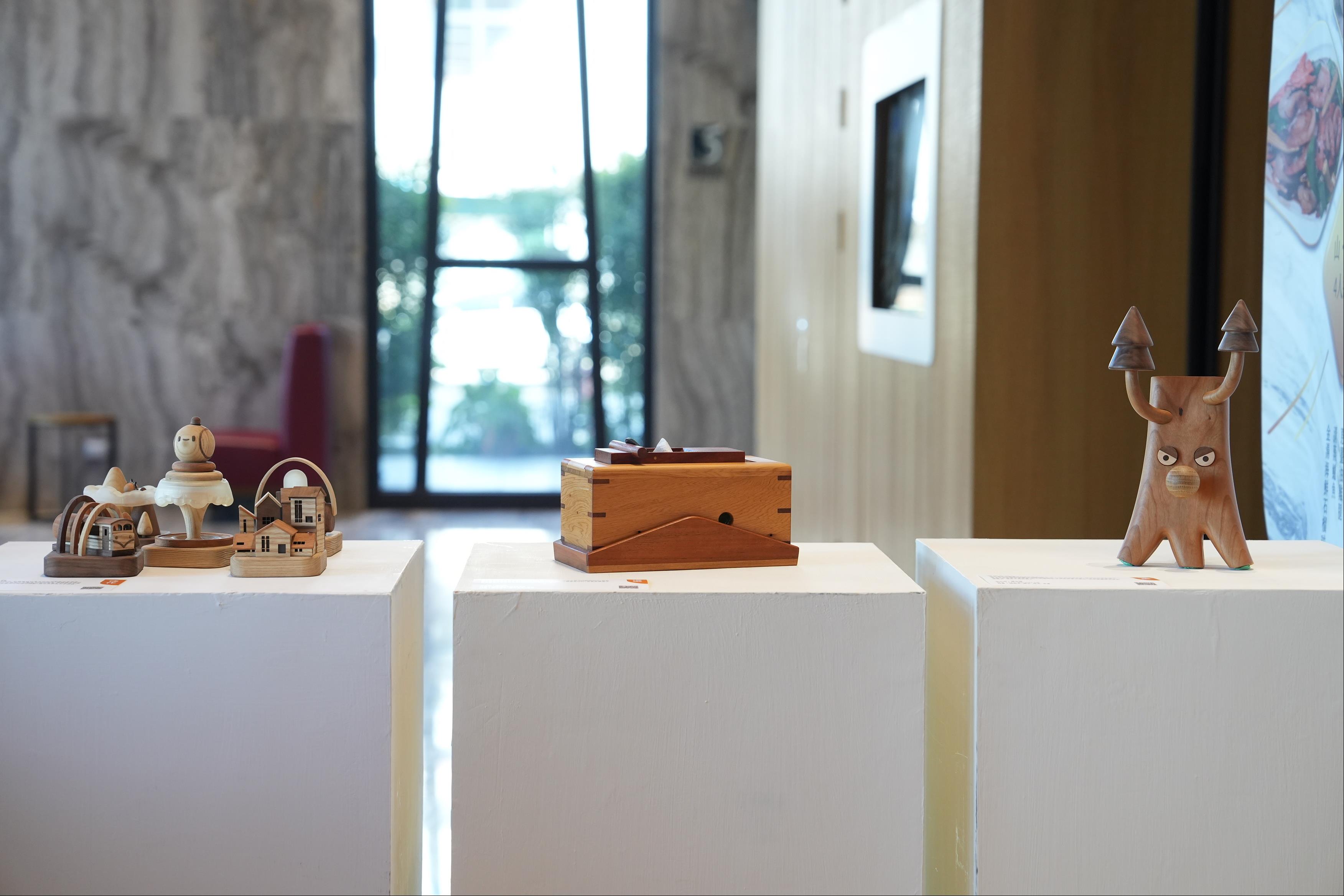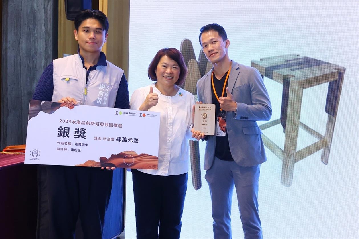文化局也同步於南院旅墅一樓大廳展出本次獲獎作品,其中對木傢俱有很深厚歷史的屏東科技大學,囊括金獎和銅獎,此9件獲獎作品分別為:金獎「步循」,得獎者為徐弘力、甘依庭,國立屏東科技大學木材科學與設計系學生;銀獎「嘉義請坐」,得獎者為謝明全,史丹利空間設計師;銅獎「相約回嘉」,得獎者為黃浤舜、張議云,國立屏東科技大學木材科學與設計系學生;優選獎「神木衣帽架」及「刨發面紙盒」;佳作獎「等你回嘉」、「嘉一點-嘉義點點系列」、「來嘉」及「野生大寶貝-野生動物保育教具設計」,這些得獎作品充分展現「嘉義木都」文化底蘊,得獎者包括在學學生和業界設計師,全國木產品好手同場競逐,各自發揮對嘉義的想像與創意,其中屏東科技大學獲得金獎、銅獎及佳作數名,顯現學生族群創意無限的潛力。