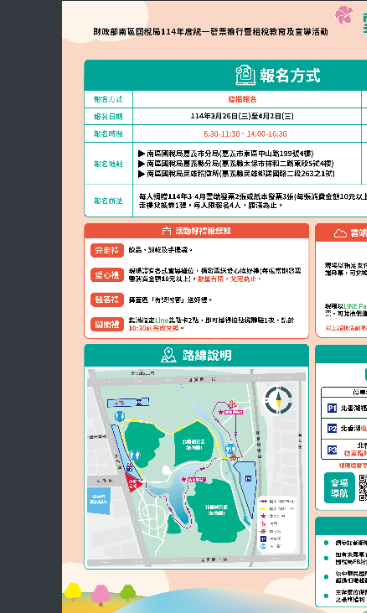 另外現場有許多宣導攤位,請多備114年3-4月發票參與活 動,捐發票送愛心換好禮。