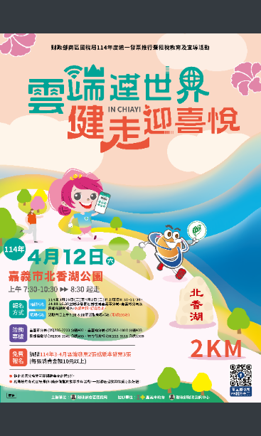 為積極推廣統一發票,財政部南區國稅局預訂於114年4月 12日(星期六)上午7時30分至10時30分假嘉義市北香湖公 園(嘉義市文化路600號)辦理「雲端連世界 健走迎喜 悅」租稅教育及宣導活動。