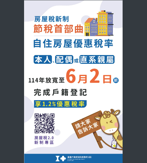 轉知-房屋稅新制自住優惠稅率設戶籍及申報期限放寬至6月2日前