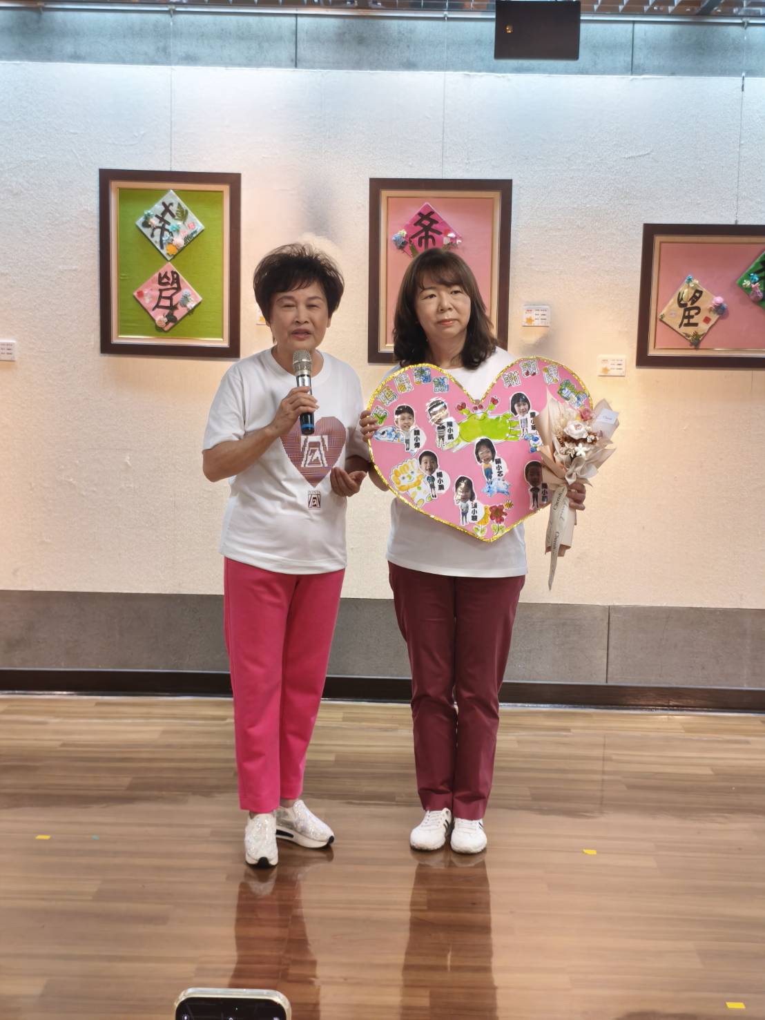 開幕式中,由崇她社社長陳明賢代其母陳趙美重女士捐款給北園國小,北園國小的寶貝們回贈自製大型愛心,場面溫馨感人。