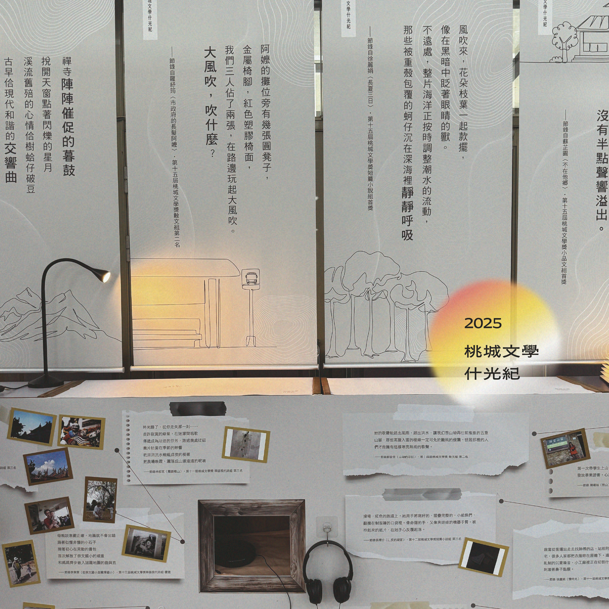 嘉義市世賢圖書館大廳自9月30日至11月23日展出「在頁裡轉聲」桃城文學獎主題展,透過聲音與文字的對話,聽見嘉義人的百工百業,齊聚2025年桃城文學什光紀「迴響嘉義321」!