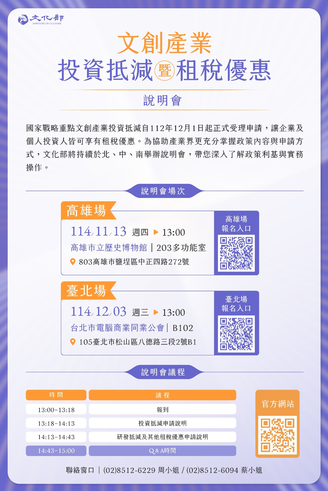 為協助文化創意業者及投資者了解投資抵減及相關租稅優惠之申請方式與規範,文化部於本(114)年度起每季舉辦推廣說明會,介紹租稅優惠內容與申請方式、作業流程與常見問題說明等相關資訊,第四季說明會資訊如下: