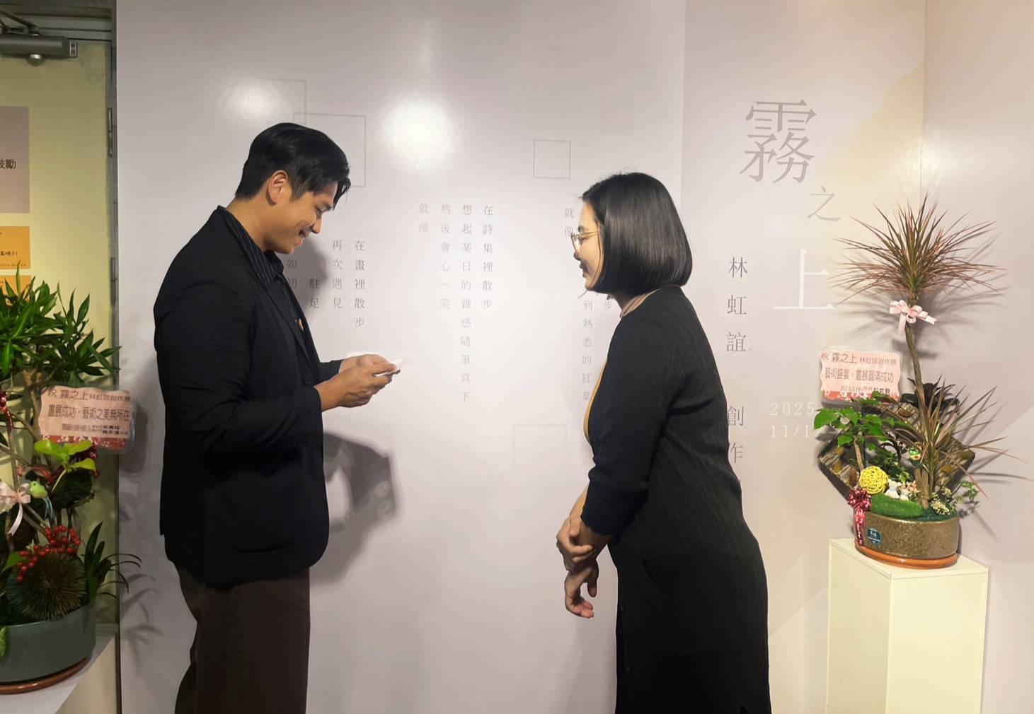 「霧之上-林虹誼創作展」11月16日於嘉義市文化局文化藝廊3樓舉行開幕式。嘉義市政府文化局局長謝育哲、嘉義市立美術館代理館長林金龍、前嘉義縣文觀局局長許有仁、王浩議員、嘉義大學視覺藝術系劉豐榮教授、逢甲大學通識教育中心尤惠貞教授、林虹誼父親陶藝家林文嶽、在地收藏家及藝術家等均參與盛會。