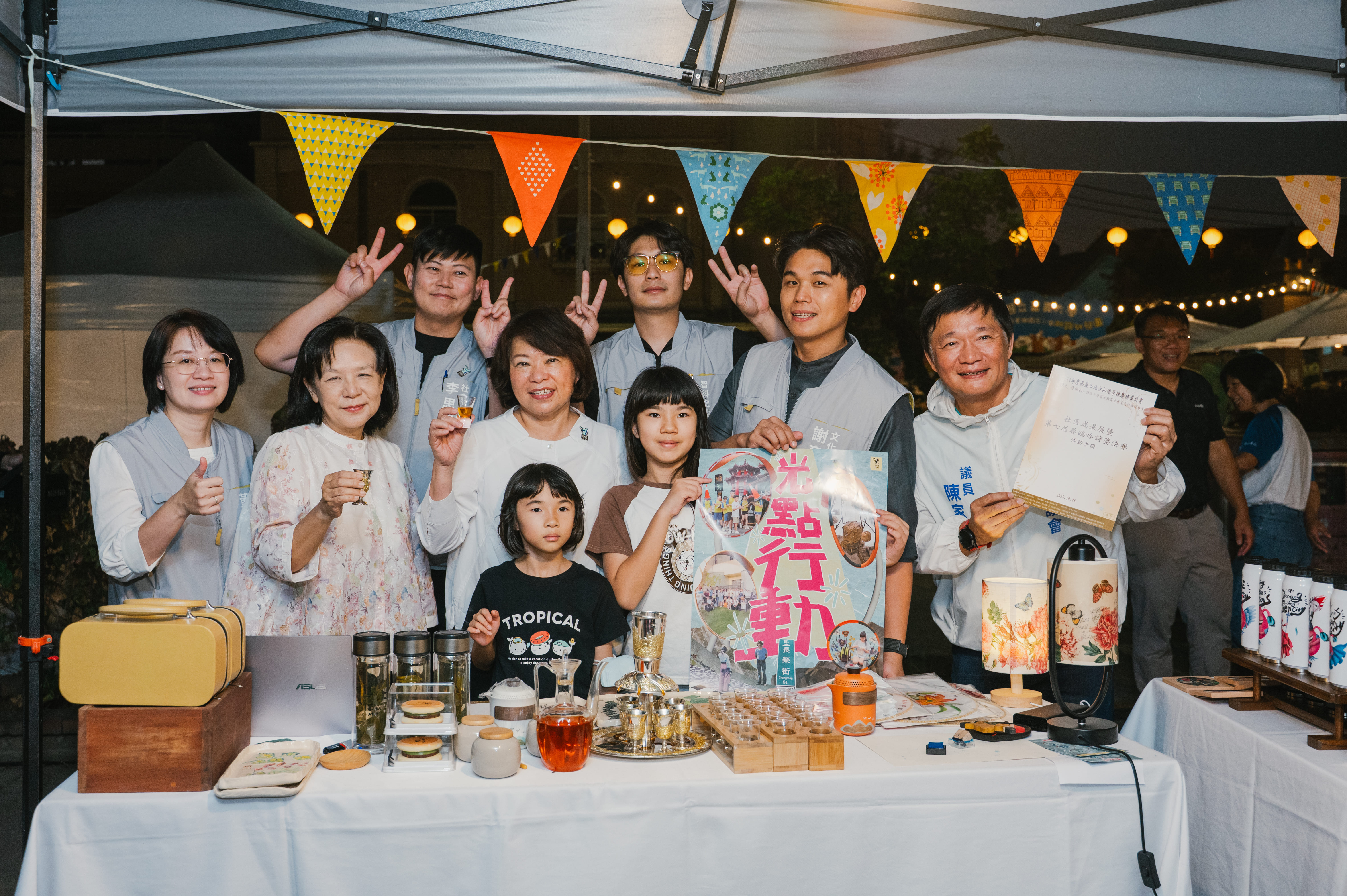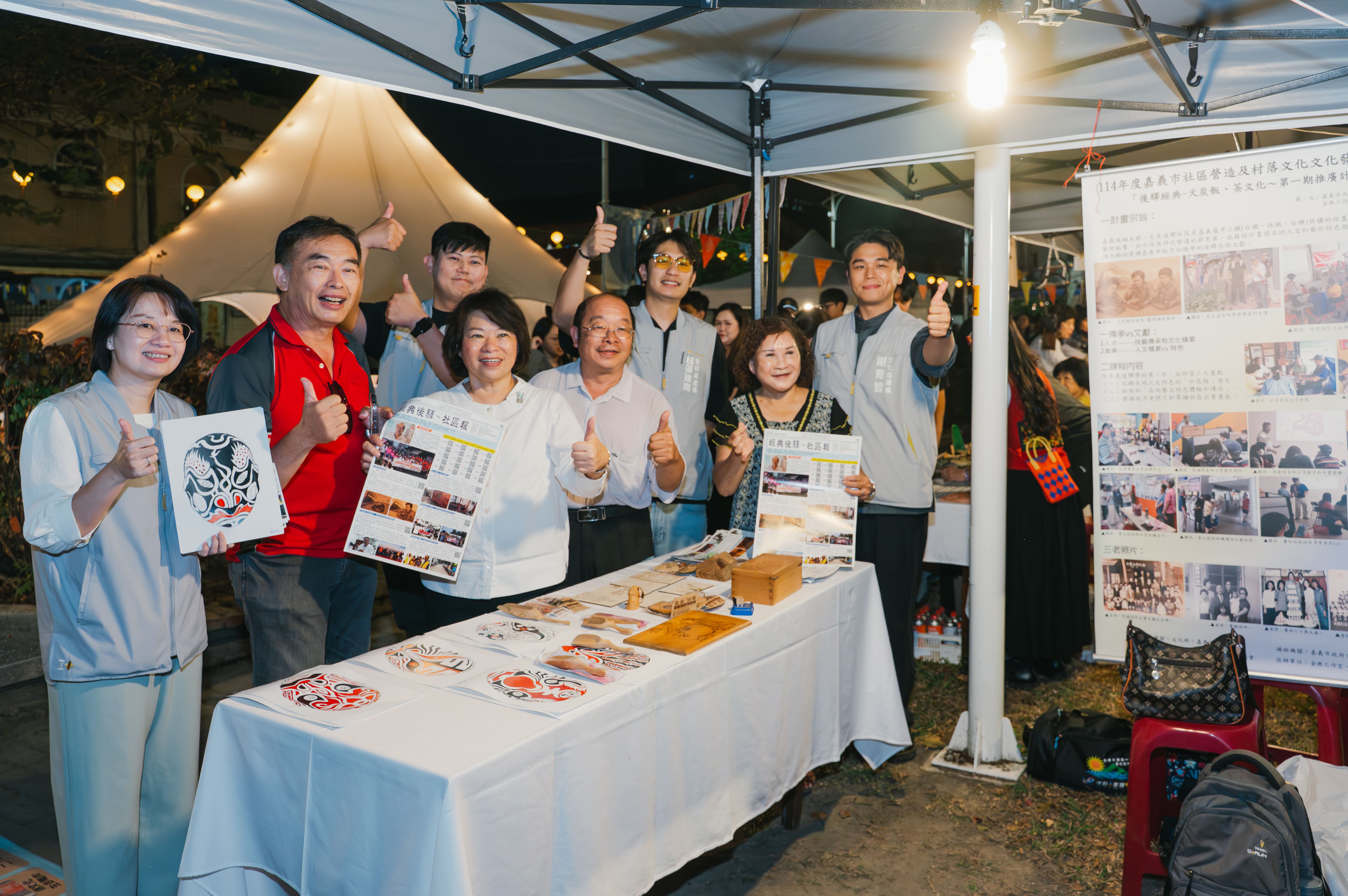 114年度嘉義市社區營造及村落文化聯合行動展,11月15日於嘉義市長榮公園(長榮街與安和街口)舉行,現場共有16個團隊共同參與,包含5個社區營造點、2個走讀社區學校、3個地方知識學推廣團體、6個社會設計行動團體。黃敏惠市長出席成果展聆聽社區團體交流分享,期盼讓文化走入街區、融入日常生活。今年以「光點行動」為主題,首度採封街新模式,跳脫傳統展場展示形式,邀集社區團體、學校與設計團隊共同打造,活動以露營風格呈現,融合爐邊故事、共食體驗與影像放映。