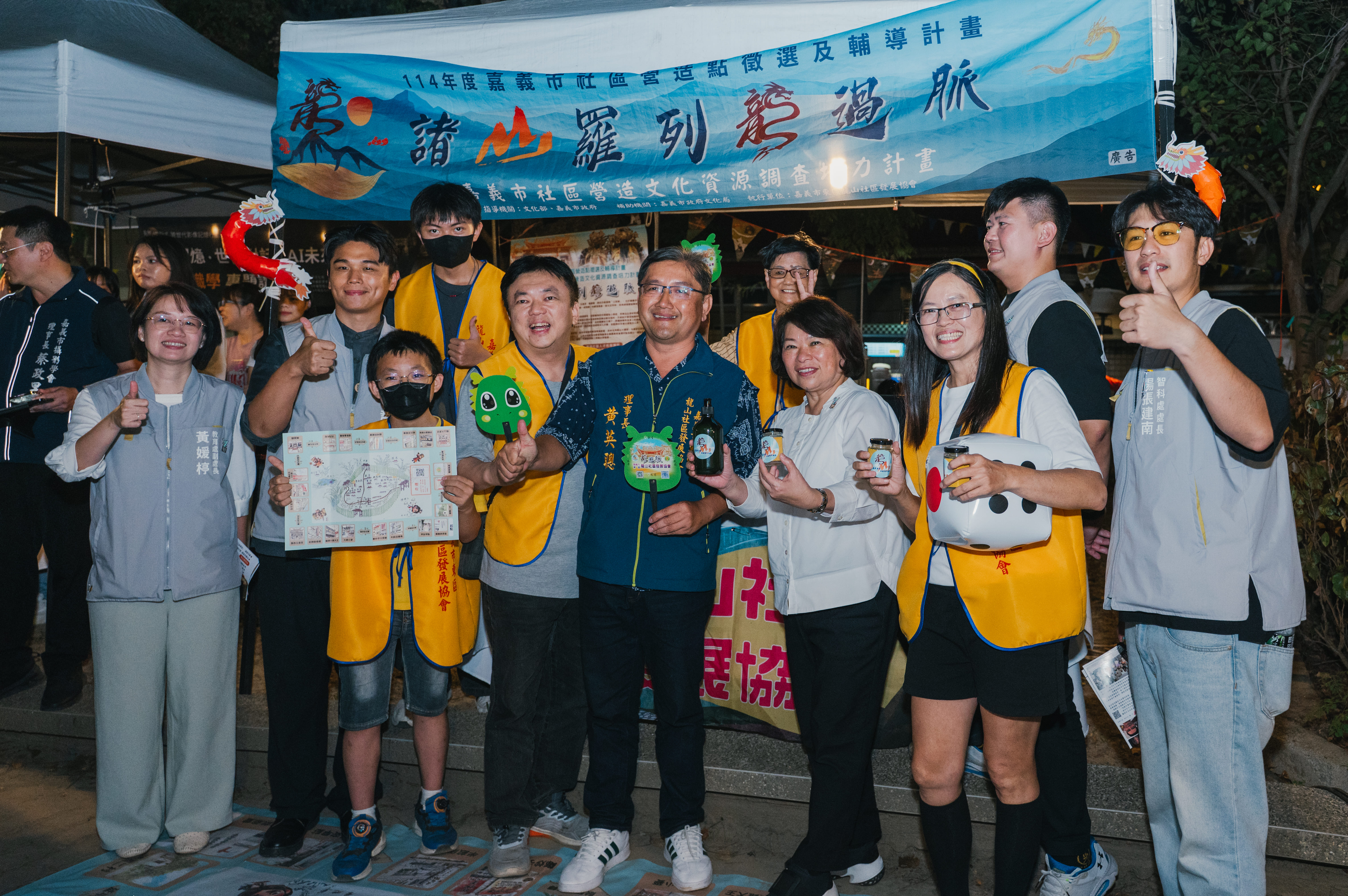 114年度嘉義市社區營造及村落文化聯合行動展,11月15日於嘉義市長榮公園(長榮街與安和街口)舉行,現場共有16個團隊共同參與,包含5個社區營造點、2個走讀社區學校、3個地方知識學推廣團體、6個社會設計行動團體。黃敏惠市長出席成果展聆聽社區團體交流分享,期盼讓文化走入街區、融入日常生活。今年以「光點行動」為主題,首度採封街新模式,跳脫傳統展場展示形式,邀集社區團體、學校與設計團隊共同打造,活動以露營風格呈現,融合爐邊故事、共食體驗與影像放映。