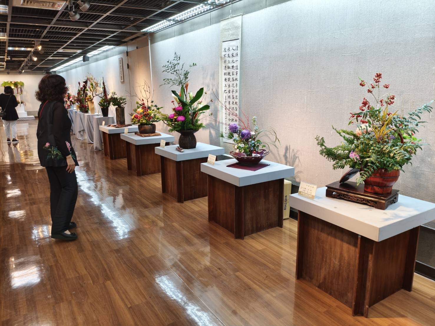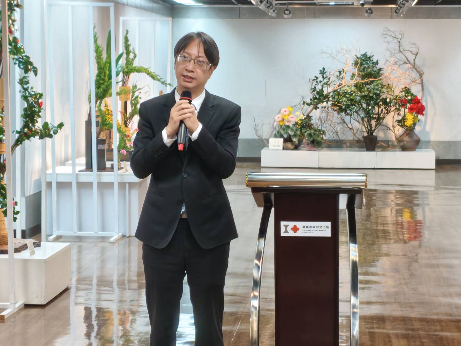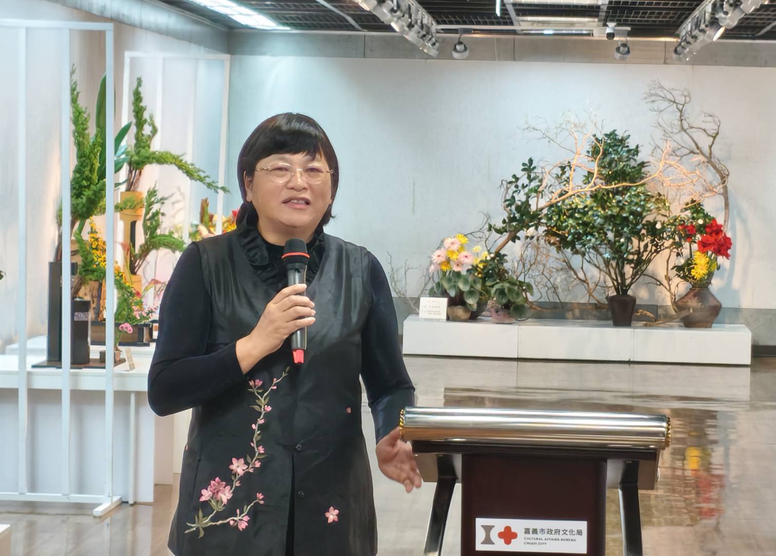 嘉義市立美術館代理館長林金龍表示,感謝嘉義市插花協會每年均在文化藝廊盛大展出,四大流派各有擅場,插花藝術由「景」到「境」,把握花朵最為綻放的時刻,從有形傳遞無形無盡的美。