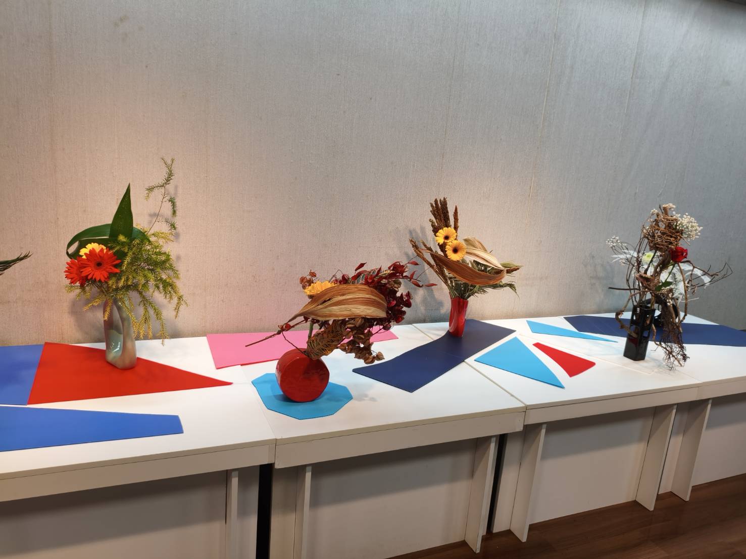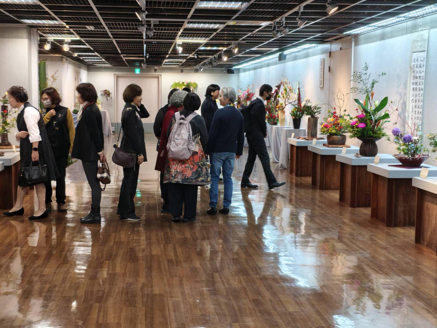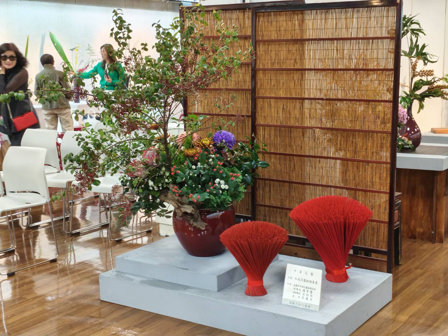 理事長楊秀鑾表示,嘉義市插花協會涵蓋四大流派,包括中華花藝、華道池坊、古流松藤會、歐式花藝,東方美學思維交融歐美現代藝術創作,不同季節有不同的花材。雖然插花協會年年辦理展覽,但每次都不會重複,會員們總是挖空心思創作新作品,從意境的開拓、情感的萌動到作品完成,都需要細心斟酌,更何況花期很短,因此插花展只有短短三天,卻要比其他展覽花更多時間進行布置與工作,為了就是呈現最美的那一刻。