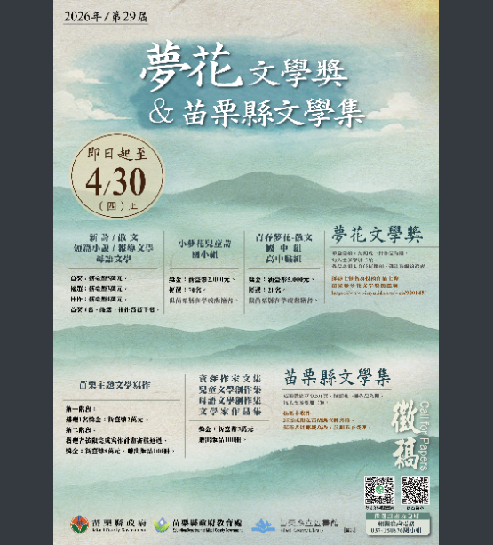 苗栗縣政府為鼓勵文學創作並傳承文史,賡續辦理2026年「苗栗縣第29屆夢花文學獎暨苗栗縣文學集」徵選活動,相關要點如下: (一)徵選項目: 1、夢花文學獎:含新詩、散文、短篇小說等7類,採線上投稿。 2、苗栗縣文學集:含資深作家文集、兒童文學創作集等5類,採成冊紙本投稿。 (二)收件時間:自即日起至115年4月30日止。 (三)活動詳情:請至苗栗縣立圖書館網站(https://lib.miaoli.gov.tw/)查詢。