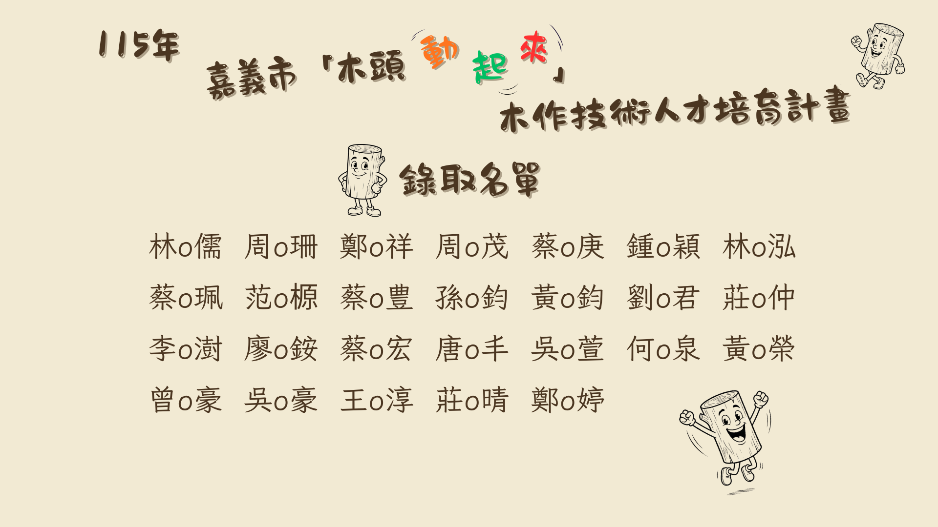 115年嘉義市「木頭動起來」木作技術人才培育計畫 錄取名單 正式揭曉,如下: