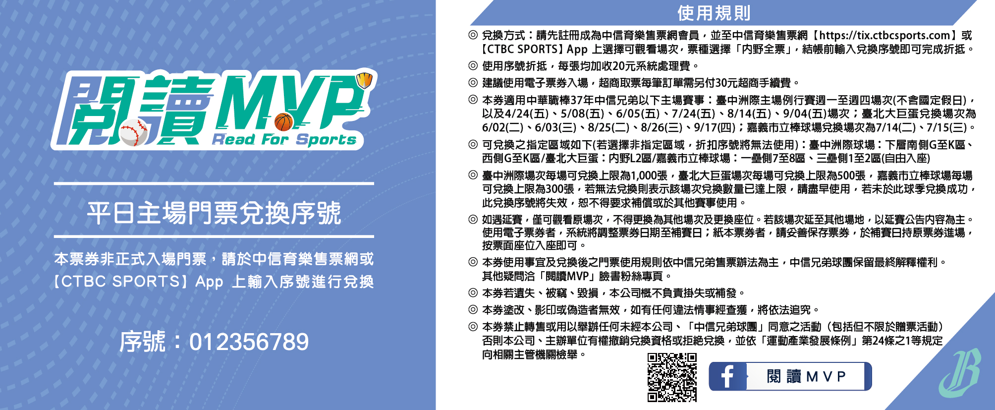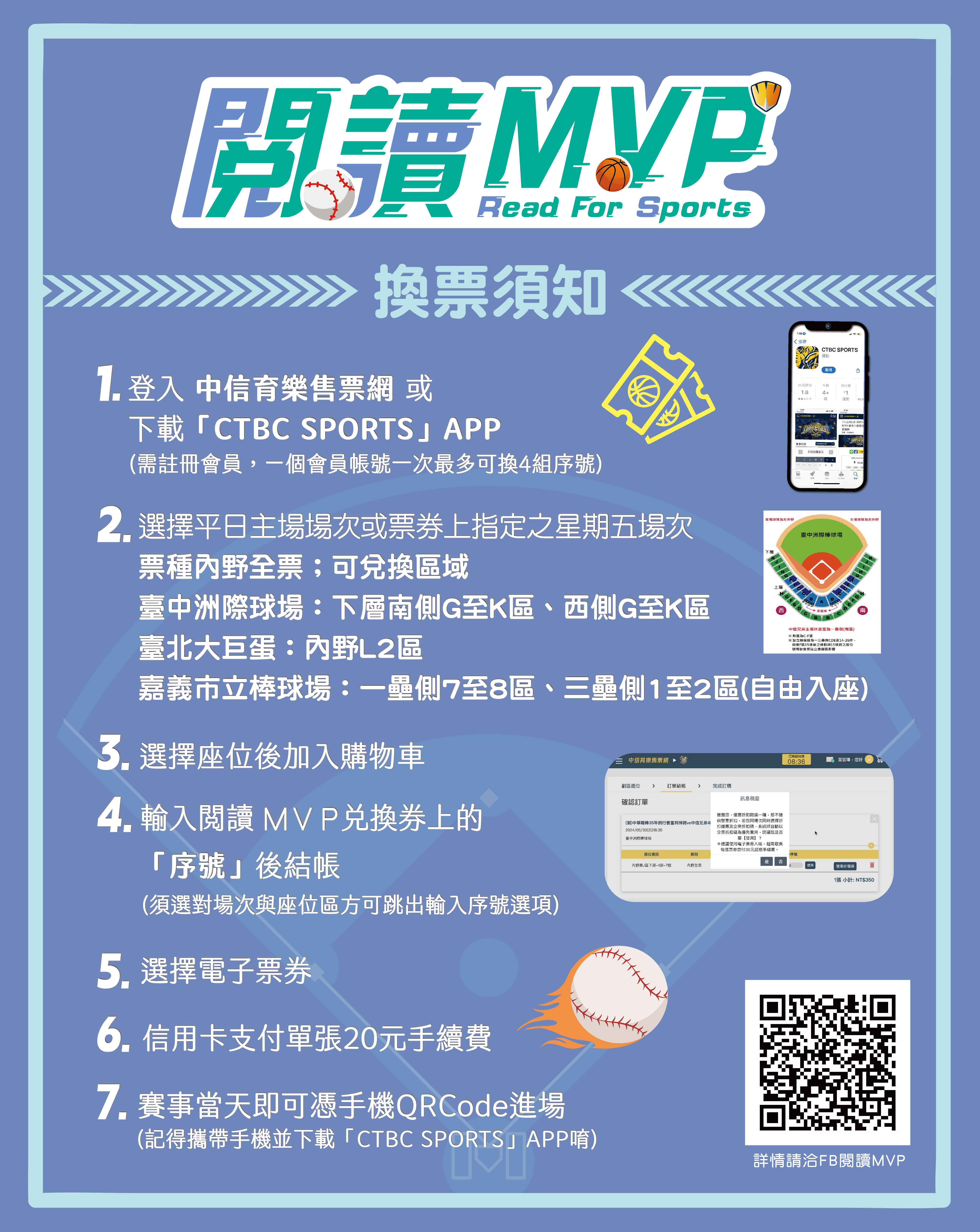 1️⃣ 按讚「閱讀MVP」FB粉絲專頁 2️⃣ 至世賢圖書館 借閱 10 本書籍 3️⃣ 掃描現場 QR Code 填寫問卷並撰寫 50 字以上 心得 👉 完成後出示畫面給館員,即可領取中信兄弟平日主場門票兌換序號乙張! (每人限領一張,數量有限,換完為止)
