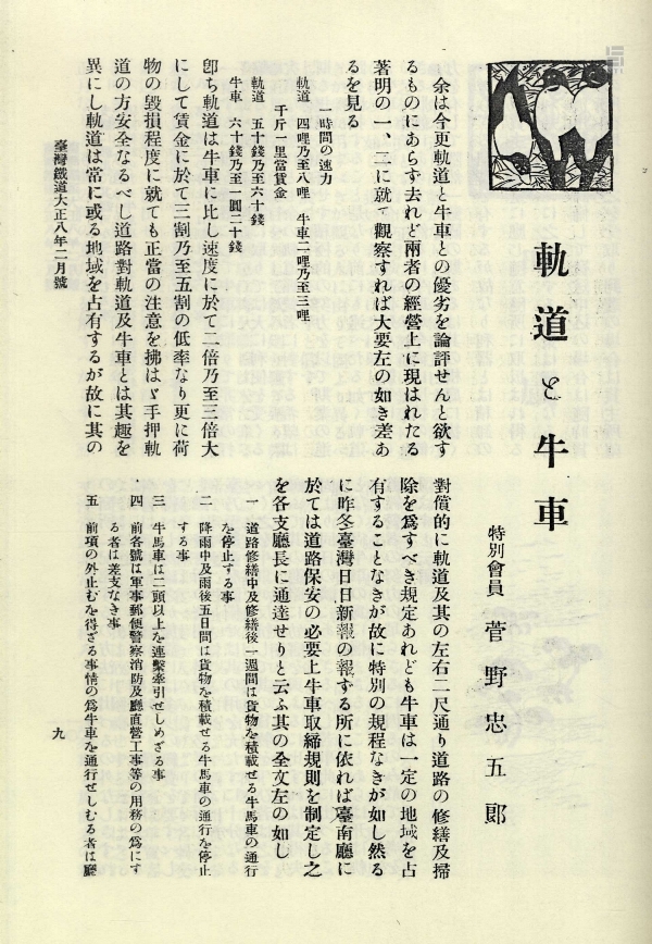 1919年一篇發表於《臺灣鐵道》期刊上的文章,題名為〈鐵道と牛車〉,剖析現代化交通建設與傳統臺灣牛車之間的競爭關係。國立臺灣圖書館授權。
