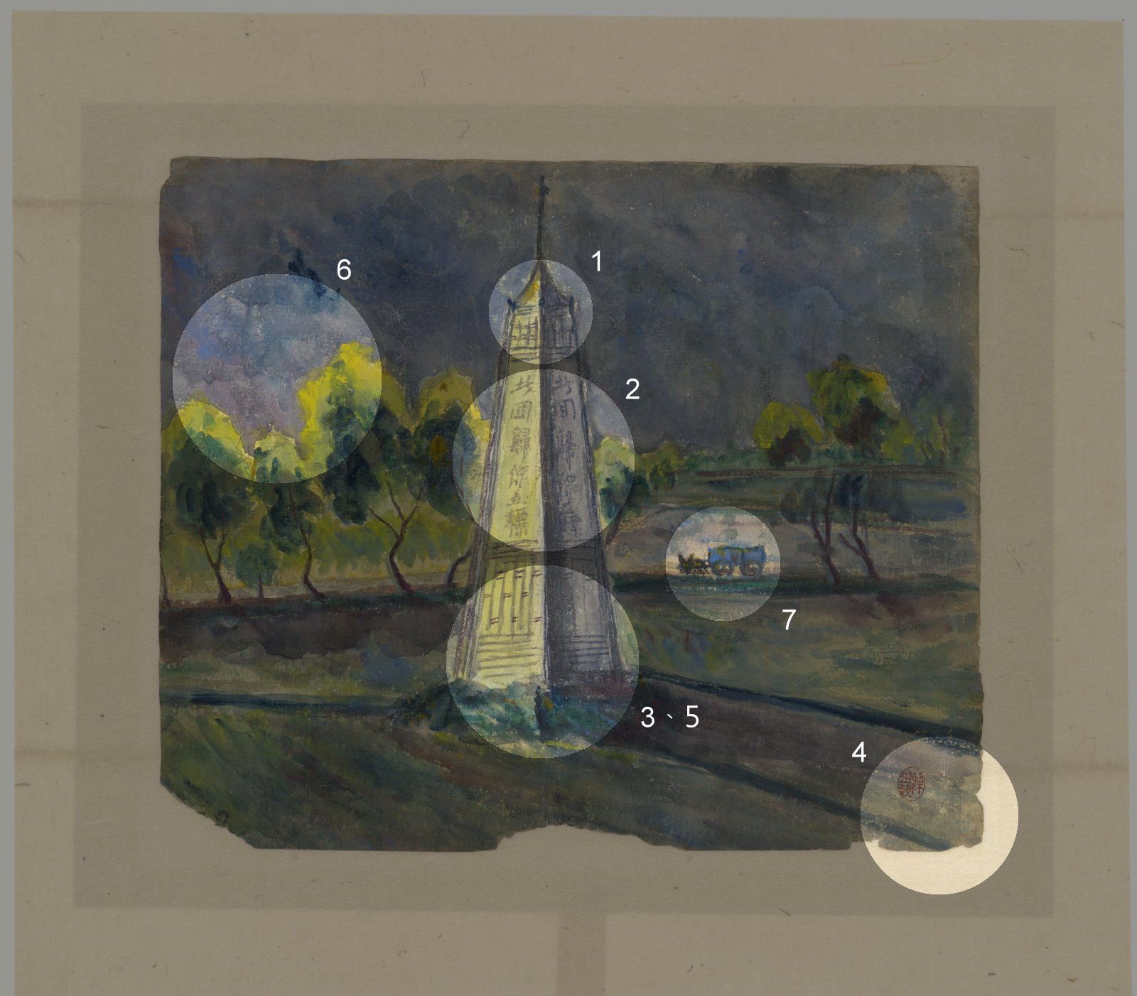 この北回帰線標塔には「北回帰線立標」と記されています。文献資料によれば、標塔の文字は本来「北回帰線標」となり、その下には経緯度が2行に分けて小さな字で記されているはずです。近代絵画においては、各々の画家が重んじる表現の細部にはそれぞれ異なる考えがあり、このような省略がよく見られます。