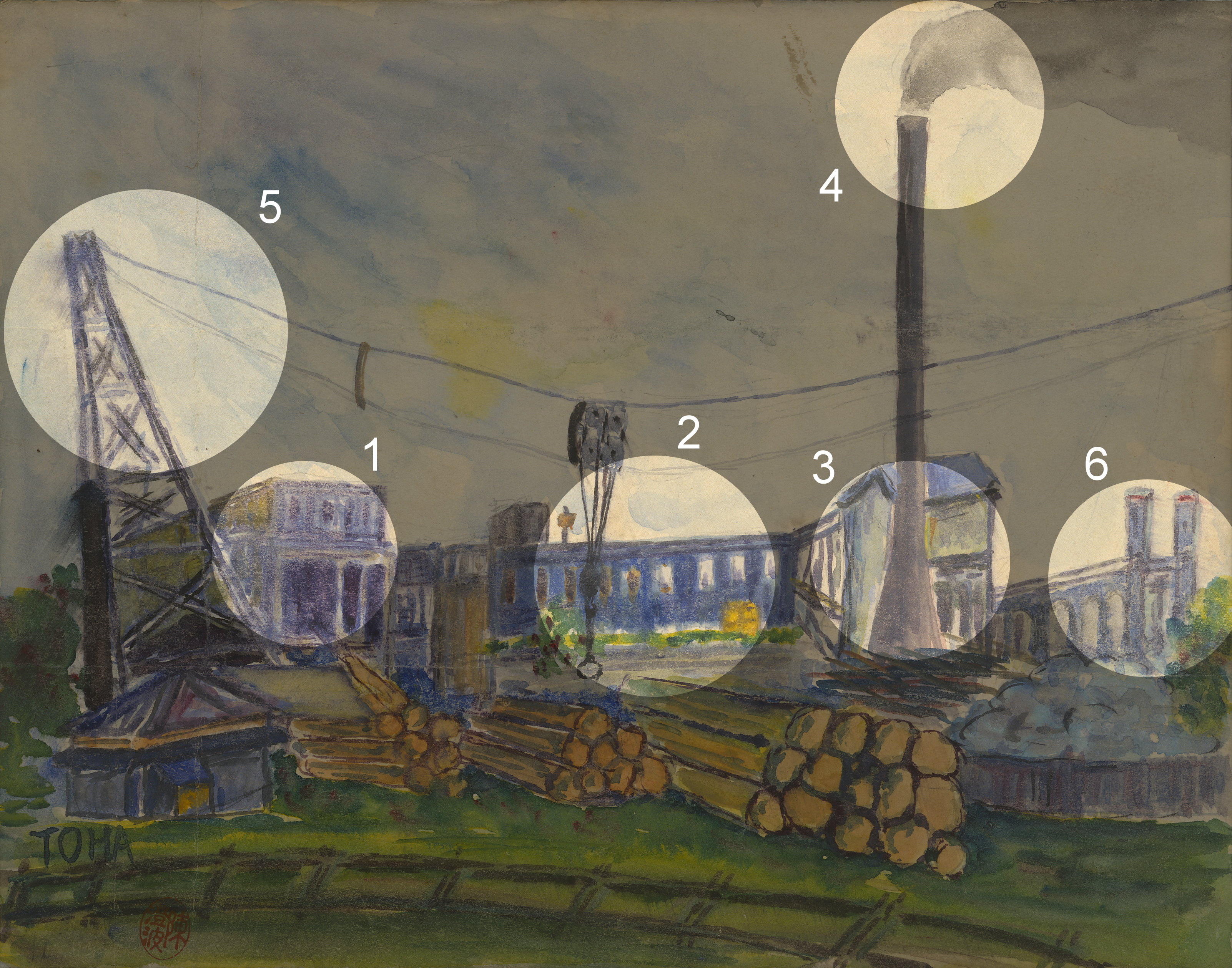 The sawdust produced during the milling process was collected and stored in this room. It was then transported to the boiler room by two conveyor belts, as pictured in the painting, and fed into the boiler to be used as fuel to generate electricity. Today, the wooden warehouse no longer stands. All that remains of the sawdust storeroom is its reinforced concrete structural foundation.
