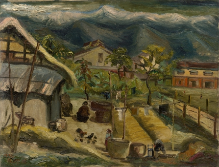 のどかな田舎らしい雰囲気の画面に、景物が細々と描き込まれています。1枚の絵に語り尽くせない物語があるかのようです。庭にいる女性の後姿が、作品全体の焦点です。鶏の群れや子供、物干し竿が取り囲まれて、黙々と働かねばならない女性の辛さを暗示しています。古めかしい農家の裏手にあるのは近代的な牧場です。三角形の屋根が遠くの山々に連なり、よどみない起伏のある動感が醸しだされています。陳澄波の画中にいつも、高く屹立して聳える玉山。いったい何を象徴しているのでしょうか。