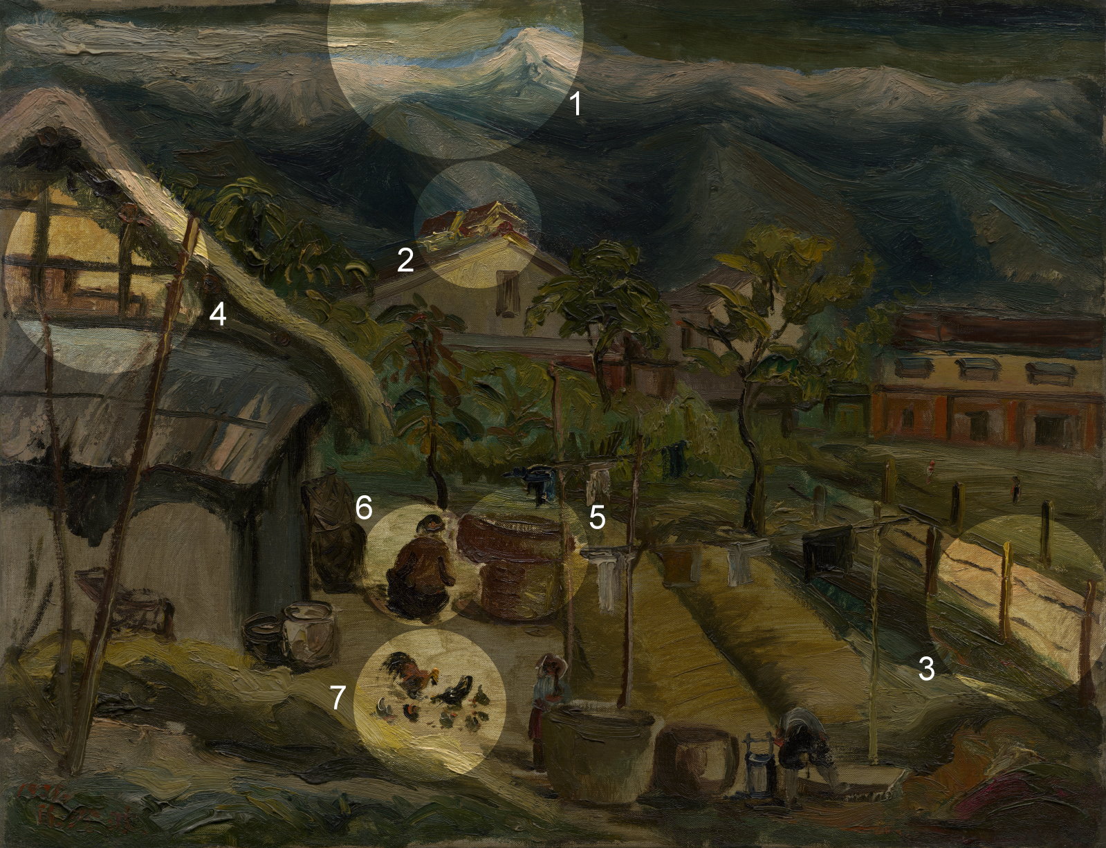 寧靜的鄉間氣氛卻擠滿了景物細節,一幅畫彷彿有說不盡的故事。院落裡,婦人的背影是整件作品的焦點。圍繞在周遭的雞群、孩子與晾衣架,都提示了她的默默勞動與辛勤付出。古樸農家的後方是現代化的牧場,三角形的屋頂接連著遠方山巒,營造出高低起伏的連綿動勢。而高聳的玉山總是屹立在陳澄波的畫作裡,它究竟象徵了什麼呢?