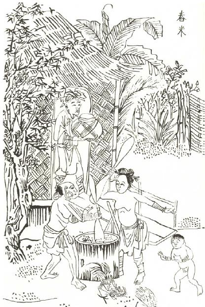 In the past, Taiwanese farmers often operated secondary businesses alongside their mainstay of crop cultivation. Many chose to raise poultry, similar to the practice of indigenous peoples living in lowland regions who had long raised chickens. Dating back to the early 18th century, this amusing drawing from The Gazetteer of Zhulou County shows a chicken pecking at grains of rice spilling forth from a large mortar and pestle.