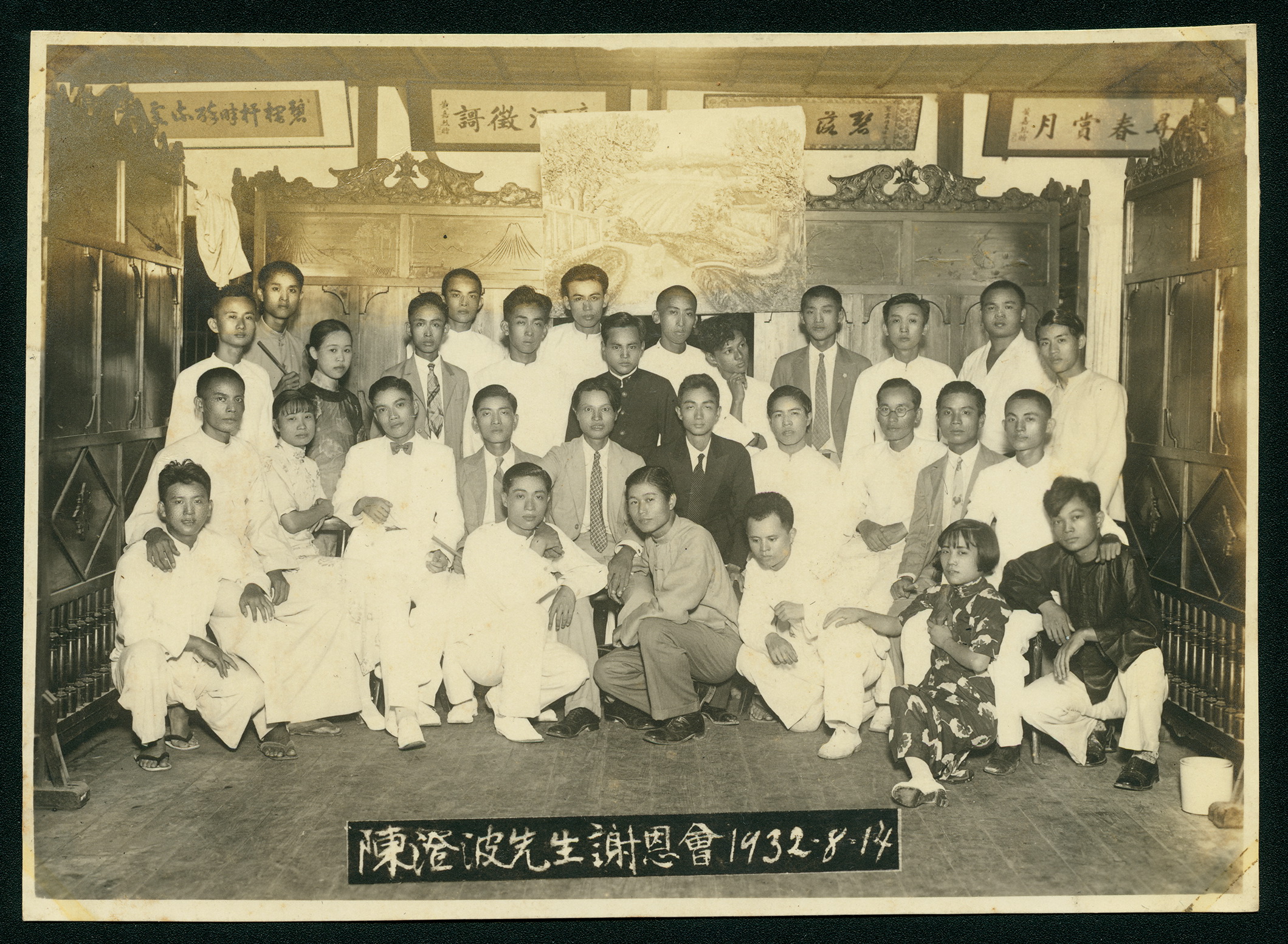 「陳澄波先生謝恩会」と題されたこの古い写真は、陳澄波と台湾人グループの記念写真です。壁には、嘉義出身の医師・黄嘉列が贈った2面の扁額がかけられ、『田園』は皆の真後ろにあります。この謎めいた「謝恩会」の背景には、どのような物語があったのでしょうか。