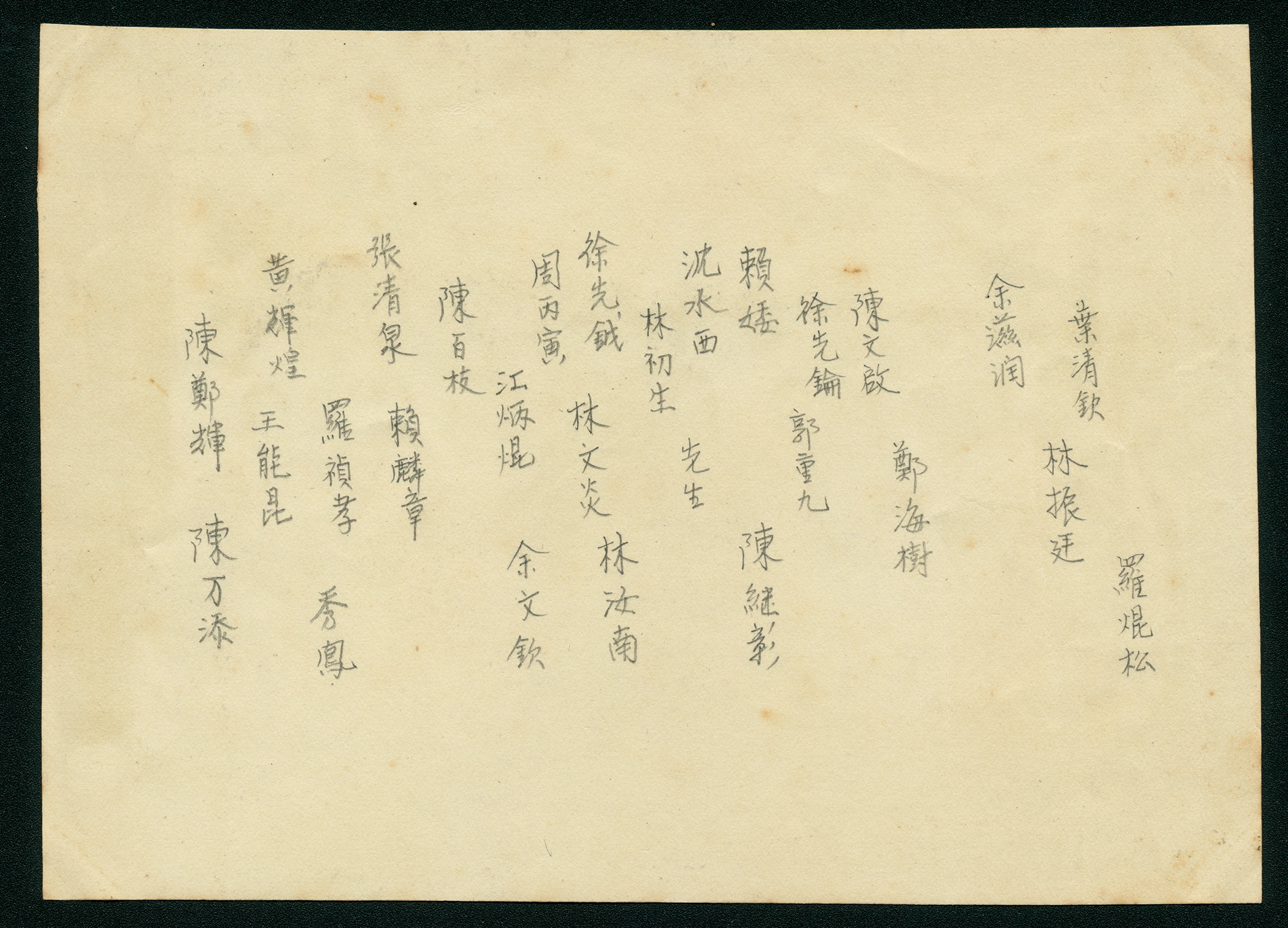 An old photograph entitled “Celebration in Honor of Chen Cheng-po” shows the artist surrounded by a group of his fellow countrymen. On the back wall hang two commemorative horizontal tablets given by Dr. Huang Jia-lie, a physician from Chiayi, while high above in the center hangs the painting Countryside. Even though this photo serves as a lasting memento of the event, the precise reason for this celebration remains a mystery.