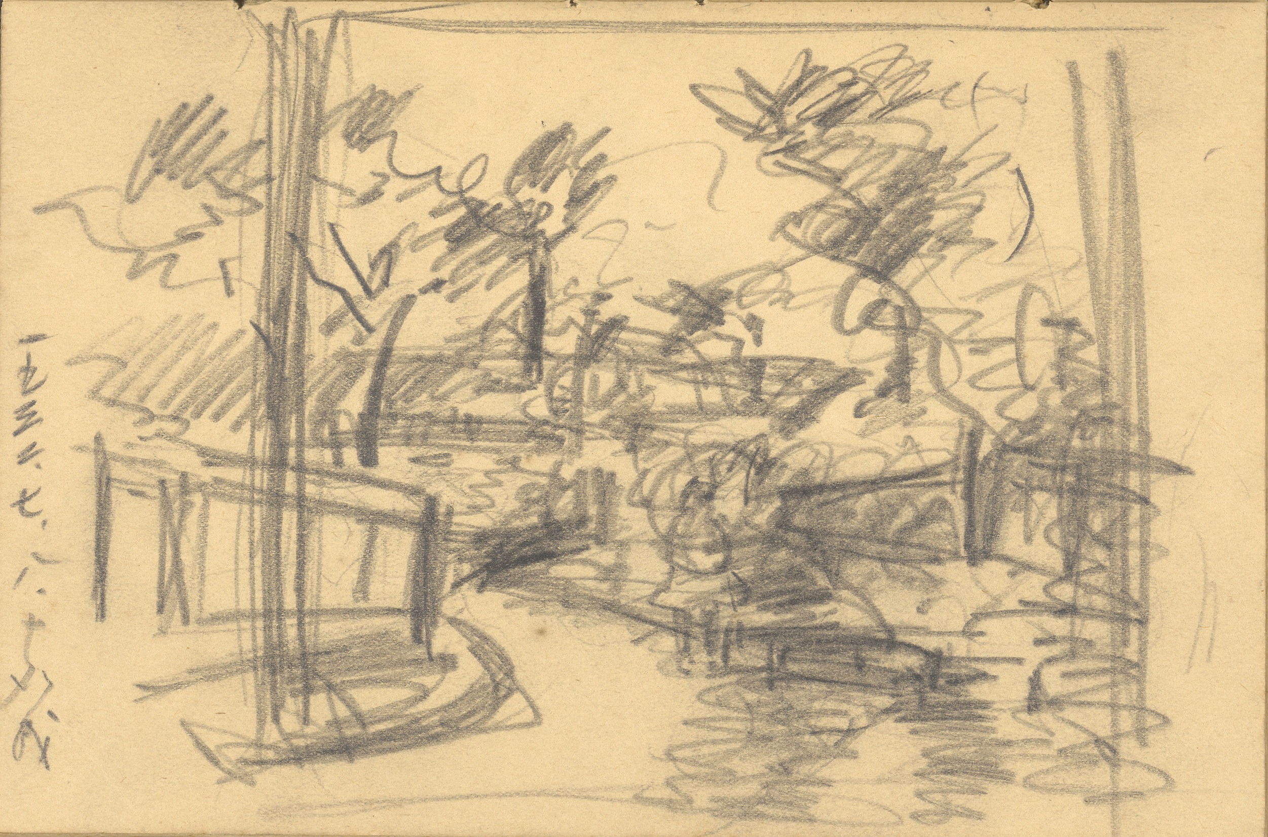 The manner by which Chen worked out the composition for Countryside is clearly illustrated in one of his surviving pencil sketches. Although he did not date the final painting, he did make a notation on the sketch. Based on this information, we know that he painted this landscape from atop a mountain slope in Chiayi’s outskirts and that it was completed sometime after July 1932.