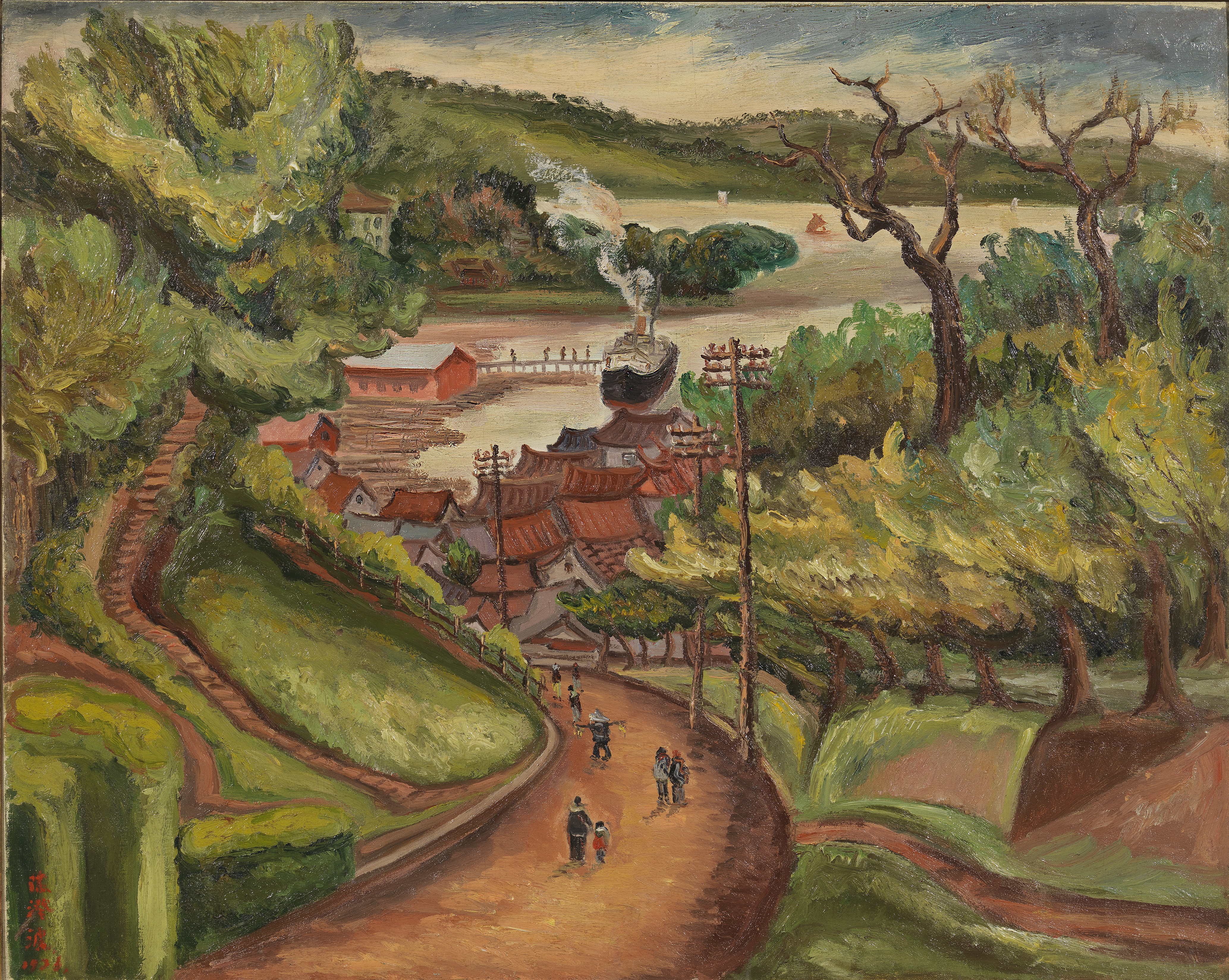 After the Meiji Restoration of 1868, Japanese women were often seen carrying parasols, one of several newly imported and fashionable goods. In modern art collections around the world, images of women with parasols have carried distinctly different connotations depending upon the context in which they were created. In Chen Cheng-po’s Taiwanese landscapes, these figures seem to draw attention to the sweltering heat which characterizes the local climate.