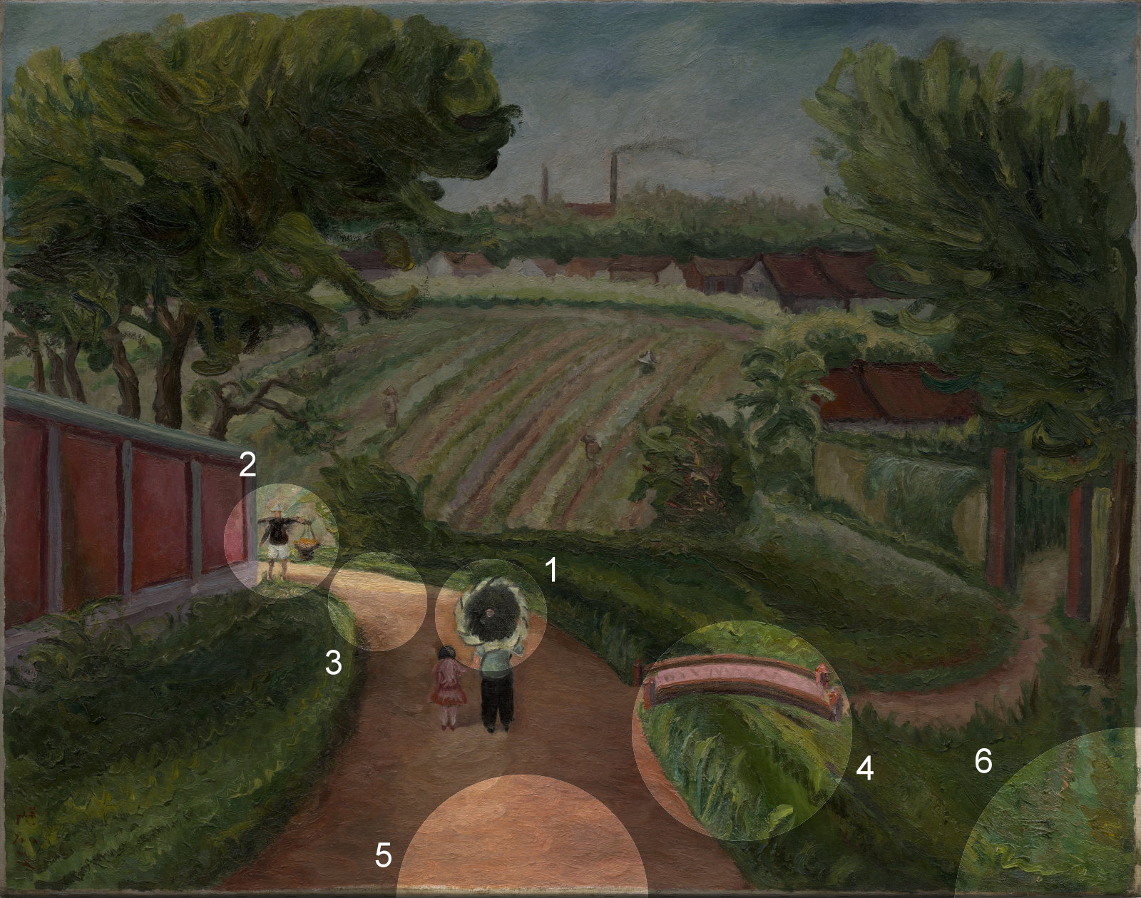 母親が子供の手を引きながら、ゆったりとした足取りで坂道を下りて行きます。もう少し先に行くと小路の角を曲がって、二人の姿は見えなくなるでしょう。手前に見える、天秤棒を担いだ男性はしっかりとした歩みで坂を上り、もうすぐ母娘とすれ違うところです。遠方に目をやると、畑に平行に並ぶ畦と農作物が整然とした線で描かれており、せっせと働く農民の姿もあります。絵を見る私たちまでが、和やかさ漂う田園風景の小路を歩いて、梢を揺らすそよ風を感じられるような気がします。