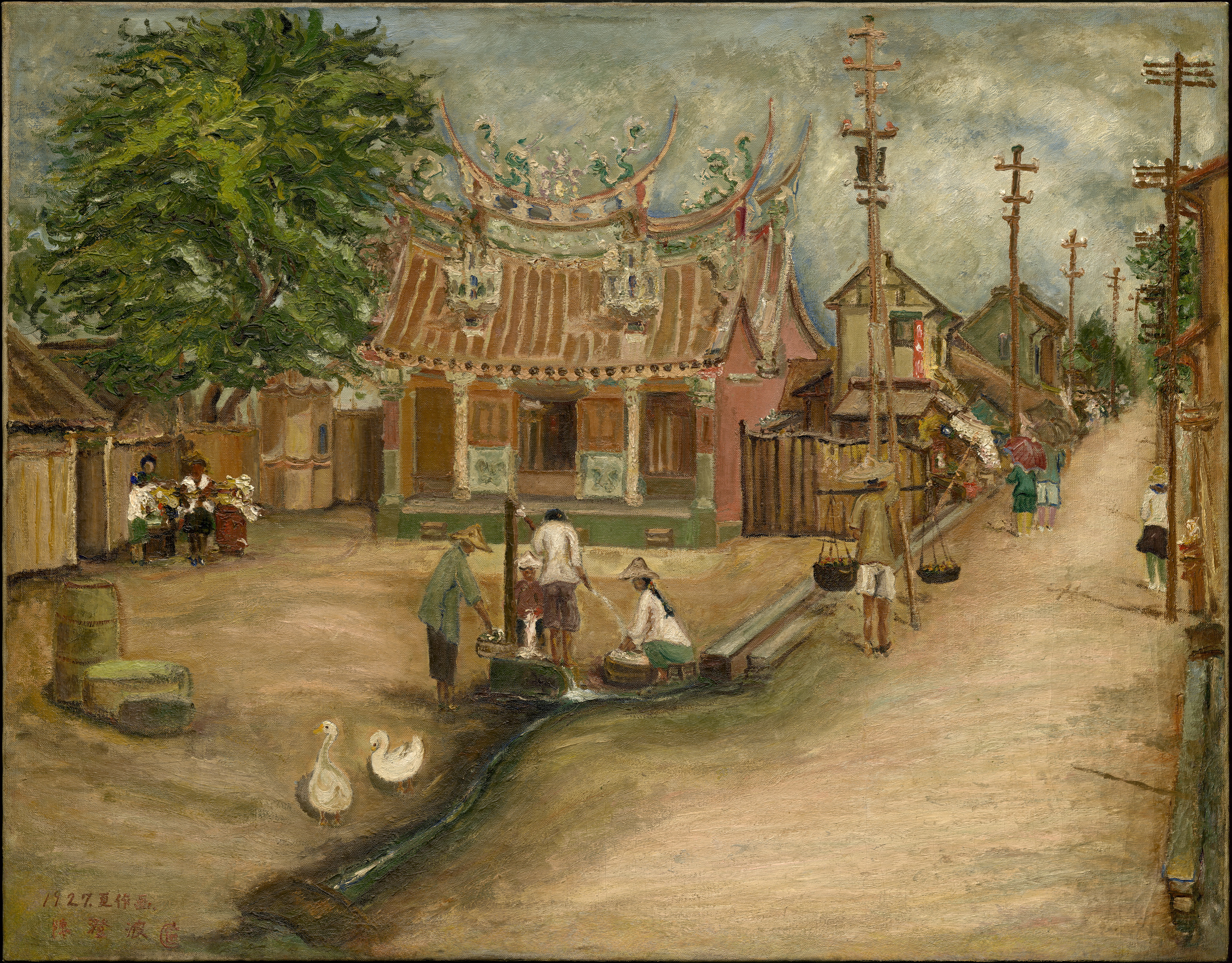 「剪黏」とは、中国南部特有の民間工芸です。台湾に伝わってからは、寺廟の屋根や「牆堵」(寺廟の壁面)の装飾技法として用いられました。剪黏は、切った磁器片を漆喰の表面に貼り付けて、いろいろな模様や形を作ります。この作品中、陳澄波は意図的に龍形の剪黏を背景の緑陰に溶け込ませています。どこに剪黏があるか、おわかりになりますか。