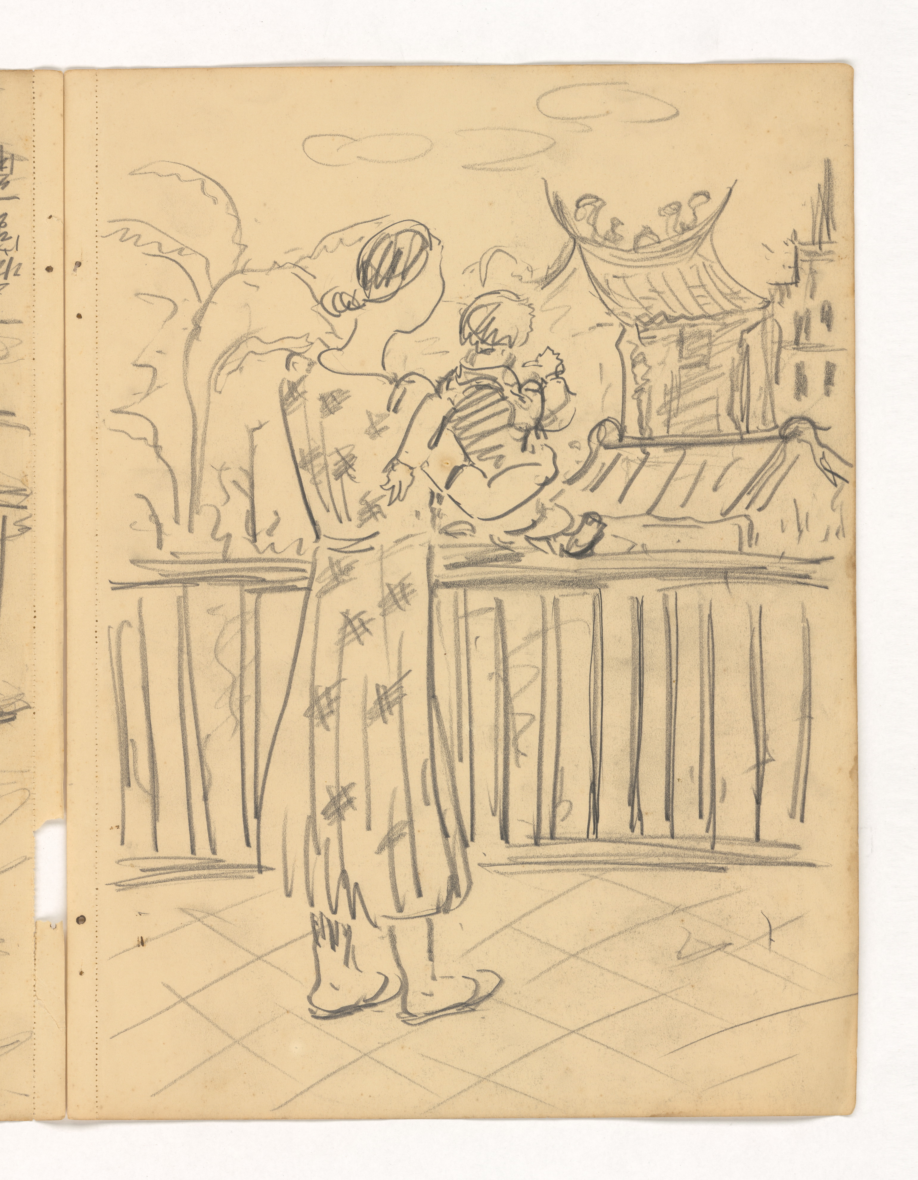 陳澄波が残したデッサンノートの中に、この油彩画と関係のあるスケッチが2枚あります。そのうちの1枚は子供を抱いた陳夫人がベランダの手すりから外を眺めている様子で、もう1枚は『初秋』の草稿です。このデッサンと油彩画を丹念に比較してみると、最終的に完成した作品は細部の空間配置に何度も変更があったことがわかります。