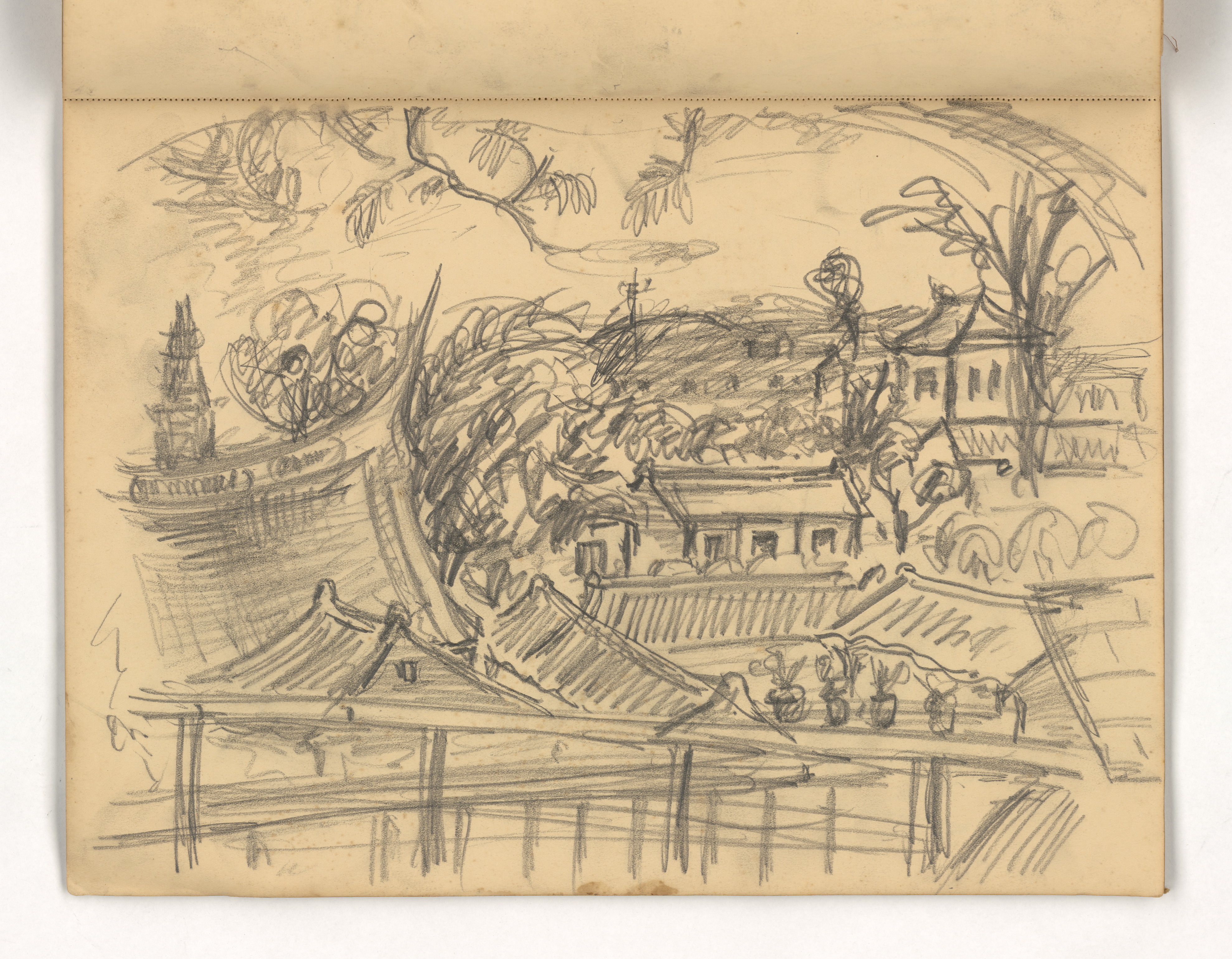 Within Chen’s extant sketchbooks, there are two pencil sketches which pertain to Early Autumn. One of these portrays a woman, likely his wife Chang Jie, holding a child in her arms, looking out over the balustrade, while the other is the preliminary sketch for this work. Upon close examination and comparison with the final painting, these sketches reveal that Chen made certain modifications with respect to the scene’s spatial configurations.