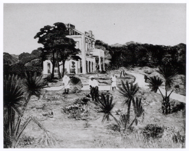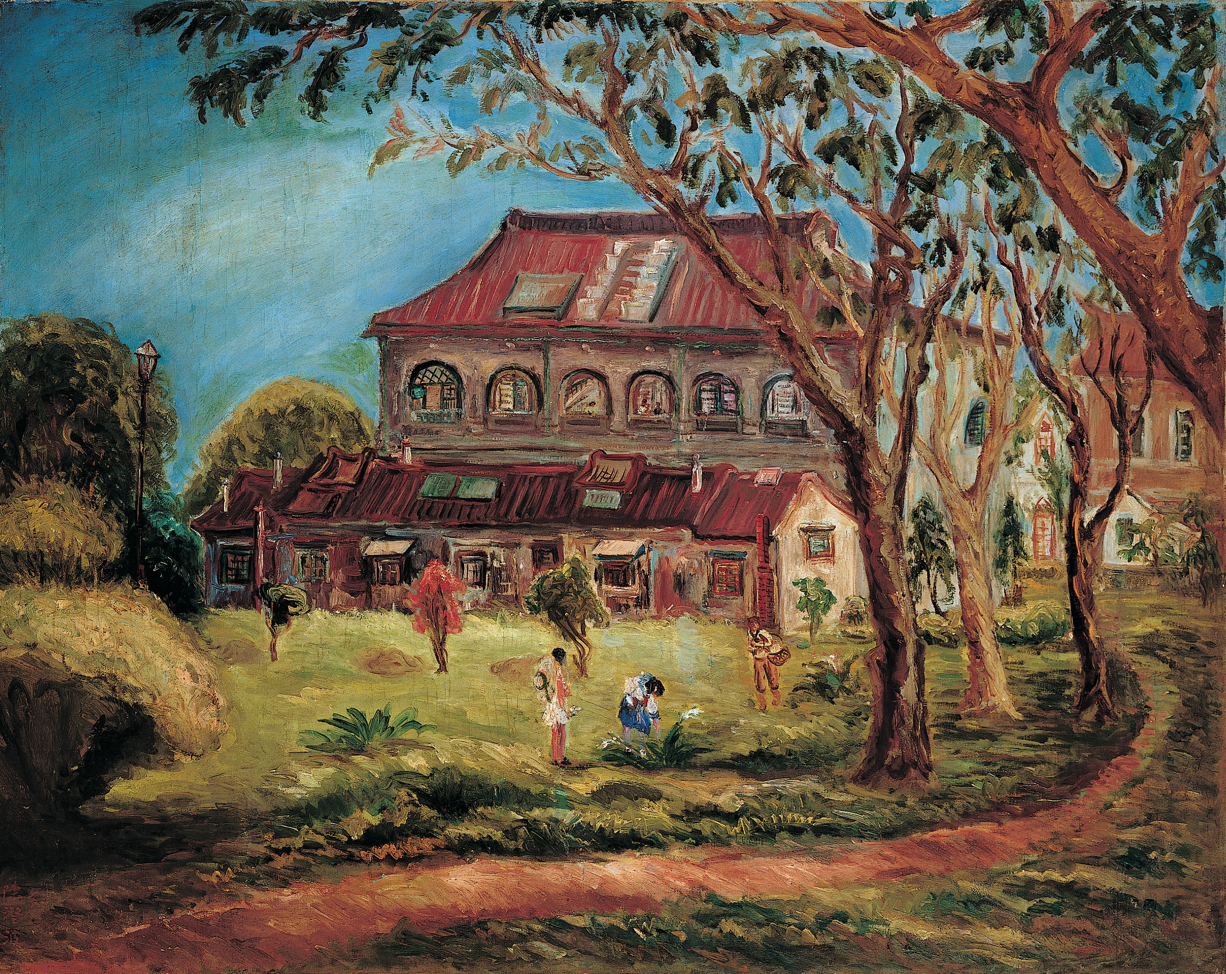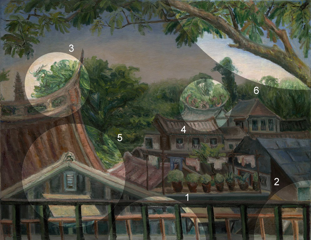 陳澄波の子孫の記憶によれば、この作品は蘭井街旧居のベランダから南の方を見て描かれた作品です。左側に見える宝塔と屋根の棟は温陵媽祖廟の裏手で、右側の樹木は裏の路地に植えられた龍眼の木でしょう。時の流れとともに陳澄波旧居の外観も大きく変化し、この絵に見える手すり付きのベランダはもうありません。